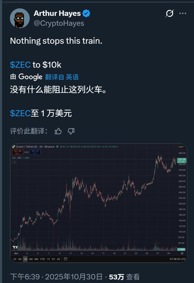 老黑 @CryptoHayes 也在狂奶 $ZEC 要去 $10K。
