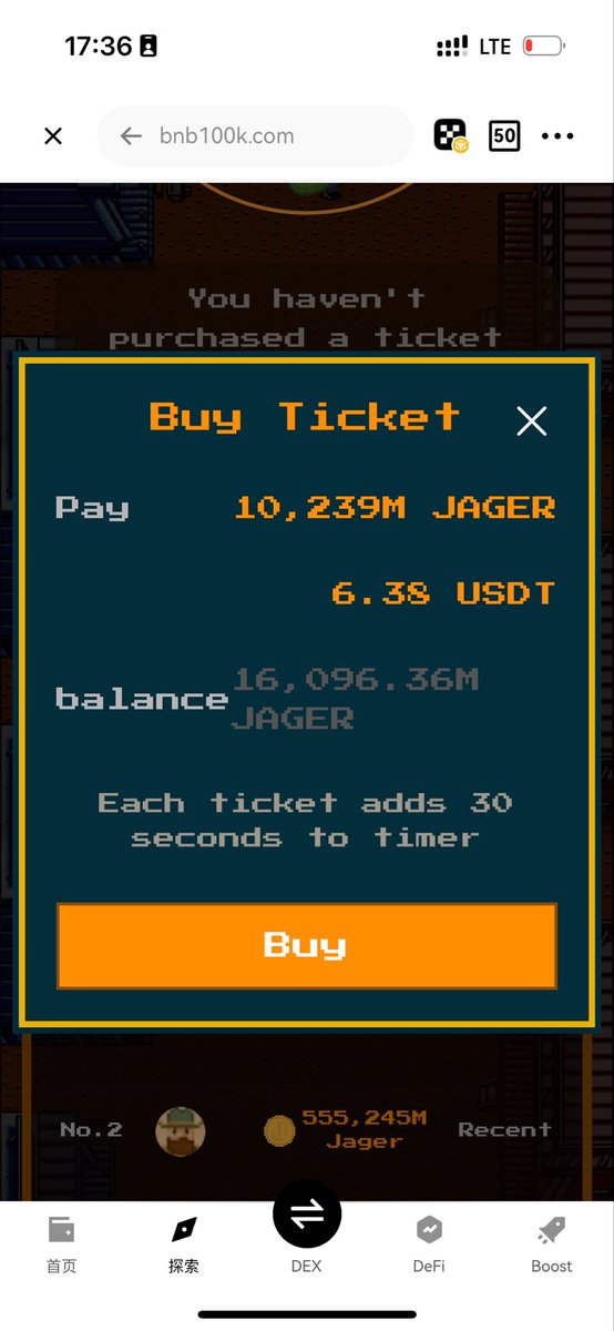 Jager又整活儿了,出了一款名为FOMO Hunt的新游戏,需要使用JAGER币才能参与。 我刚买了一张票,加入了游戏体验了一下。随着参与人数的增加,票价也会不断上涨。 可以访问官网查看完整规则, 简单来说,这是一款链上倒计时游戏。 每购买一张票,倒计时就会延长,奖池也会随之增加。 倒计时结束后,最后一位购票者将获得第一名, 排名前12位的玩家将根据排名瓜分奖池。 目前游戏正处于第一轮,早期参与者将永久获得HunterTime税收奖励。 这意味着早期参与者不仅可以以更低的成本参与,还能获得长期的奖励资格。 总而言之,这对JAGER代币来说是利好。 感兴趣可以参与试试。
