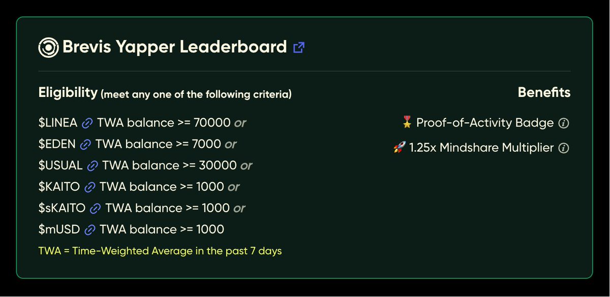 Brevis 以链上交互重构 @KaitoAI生态规则,baby觉得这种模式是必然趋势,从嘴而嘴—鲁而鲁—价值交换 核心变革:从纯嘴撸到链上交互 Kaito 纯嘴撸无实质链上行为,靠内容为主的模式要结束了,比如之前FF defi玩法再次印证了项目方更加注重交互,质押的玩家 Brevis 成为首个改革者,将链上交互 定为获取 Kaito 核心资格,但是呢还是 Yapper 排行榜为主要关键 Brevis Yapper 排行榜(第2阶段)准入资产条件 钱包需持有以下最低数量资产: - $LINEA ≥ 70000 - $EDEN ≥ 7000 - $USUAL ≥ 30000 - $KAITO ≥ 1000 - $sKAITO ≥ 1000 - $mUSD ≥ 1000 关键技术:零知识证明(ZK)的应用,用户无需暴露钱包隐私信息,即可通过 Brevis 的 ZK 证明技术,验证自己满足链上资产条件 成功证明的用户可解锁 1.25倍 Mindshare 乘数,更易进入排行榜前列 我个人觉得之前 InfoFi 确实有点走偏,虽然说创作者能靠写文赚钱,但太多没营养的内容堆着,看着都烦。现在加上链上行为的门槛,至少能把那些光靠嘴说、没真金白银参与的人筛出去,留下的才是真的看好项目的人,这点我觉得更加公平把! 而且 Brevis 用 ZK 证明这步我是真佩服,既不用泄露钱包隐私,又能快速验证资产,解决了个大麻烦。这种真参与才有真权益的模式,我感觉以后肯定会有更多项目学,反正我是挺看好 Brevis 这么干的 @brevis_zk