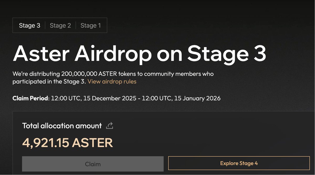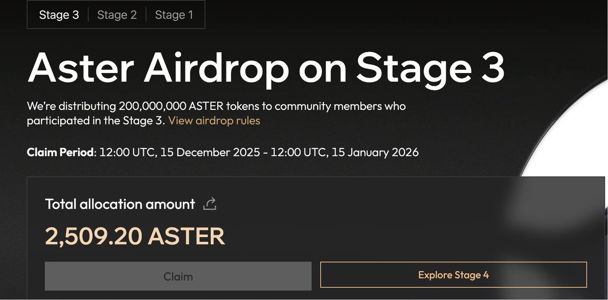 Aster Stage 3 空投可以查询了! 查询链接: 领取时间:12月15日到26年1月15日 看了下第三季几个号加起来1万来个 $ASTER 吧 话说这次下跌又跌到0.9刀左右的CZ底了 还有抄底的兄弟们吗! @Aster_DEX @cz_binance @justlovejk3