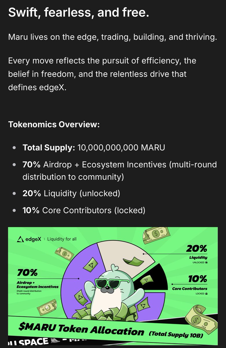 现在大家对空投话题特别敏感,对于edgeX我现在想法反而是觉得代币分配也许都是一个框架,后续真正会影响到价值的是整个生态有没有真的在增长。 看到edgeX把40%分配给生态、25%给创世,其实可以反过来想他是把最大的筹码留给未来,那我们能做的就是观察他未来是不是有真的把模组和金融系统做起来。 我自己的习惯还是一样:不急、不猜、看数据说话,期待看到可爱的海豹飞起来 @edgeX_exchange @edgeXMaru #edgeX #空投 #MARU $MARU