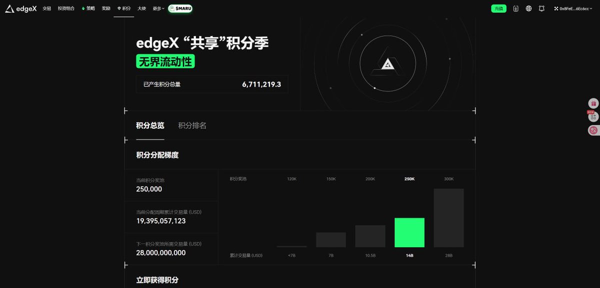 是不是这几天看 @edgeX_exchange 又是积分又是meme币又是USDT的奖励看得云里雾里 给大家紧急出一个各种姿势爽撸edgex的指南! 欢迎大家用我的邀请链接: https://t.co/LgwlH3vLTg 1️⃣edgeX Open Season 这个是dex普遍的“交易量→积分→空投”模式的活动 主页点上方points即可看到这个活动 积分分配标准是什么? 交易量:60% 邀请+大使+活动:20% TVL和金库积分:10% 清算积分:5% OI积分:5% 积分每周三早八分配,也就是中国时间下午4点 目前已经进行到25周了,距离活动结束仅剩不到两周的时候,已经产出了6,711,219.3个积分 大家可以发现这个活动有个积分分配梯度 也就是,当本周期的累计交易量达到下一个档位时,本周期分配的积分也到达了下一个档位 比如这个周期目前是14B交易量,250K积分的档位 想要到达28B就需要更多人去刷 这样的机制挺好的,极大的缓解了蛋糕越分越少的问题,越多人进来卷,晋升到下个积分池的速度就越快,奖励就越多 2️⃣‘.edge🦭’ Creator Campaign 这个是需要改名的嘴撸活动,类似于budilpad的嘴撸 需要在id后面加上".edge🦭" 大家点击主页上方的 $MARU 就可以看到 总奖池:20M $MARU +50 万 USDT+3个EpicSer NFT 活动时间:11.3-12.3 前几天发放了第一次奖励,好多大佬都赚麻了,现在还有12天接近两周的时间,还有的卷呢 记得点赞,转发和评论官推,这个很重要 https://t.co/3limR0peLG 然后加官方dc和tg群 每次写推文必须要艾特 @edgeX_exchange ,要不然识别不到 每个关于edgex的推文务必提交到表格→ https://t.co/UPBkWwhxX9 edgex的嘴撸活动就这么简单~~没什么其他要求了,快卷起来
