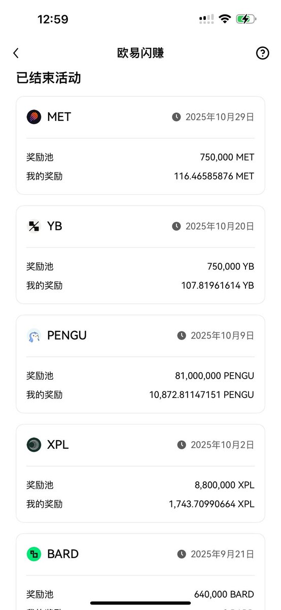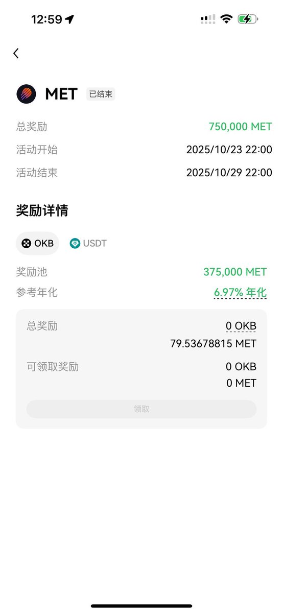 昨天 #OKX 上的菜也收了,这期是 200 枚 $OKB 和 2万的 USDT 组成的收益池,一共 7 天的时间,全部第一时间打满,一共拿到了 116.47 枚 $MET ,按照 MET 的价格,总收入是 55 美元,总投入就按照 50,000 美元计算吧,总年化收益是 5.9% 。