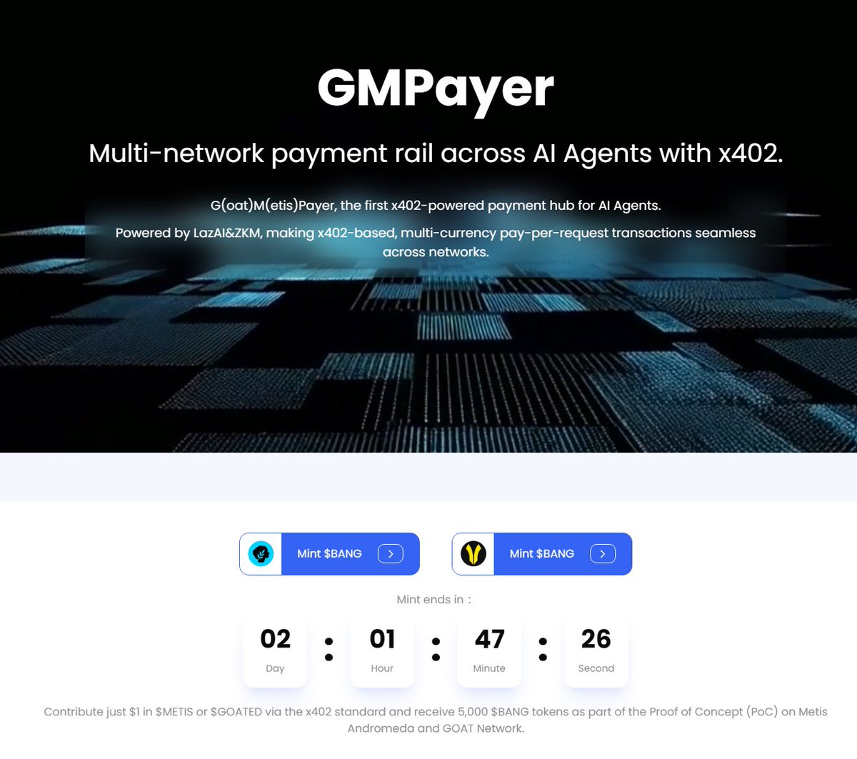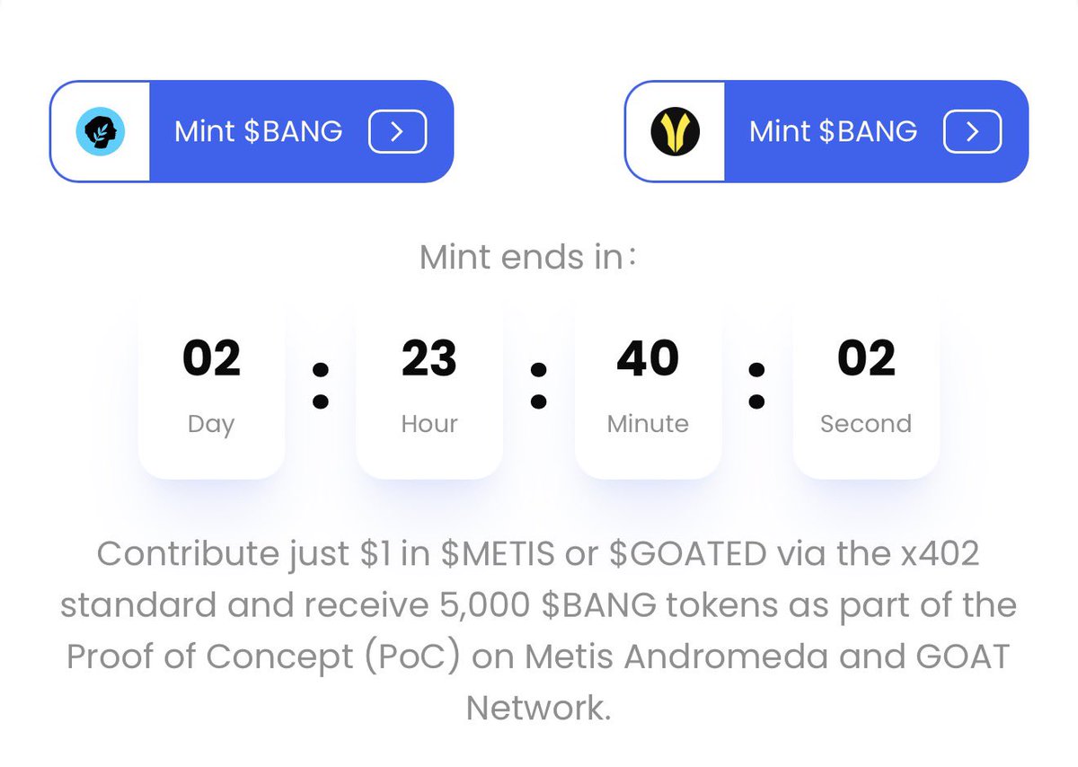 现在,项目方还推出了一个概念验证代币 $BANG ,让大家能亲身体验这个系统。 $BANG 在Metis Andromeda和GOAT Network上同时发行,总供应量是10亿枚,每条链各5亿,其中2.5亿用于代币铸造,2.5亿用于流动性。参与方式很简单:通过x402标准在 $xMETIS 或 $xGOATED 中贡献1美元,就能获得5000枚$BANG代币。铸造从北京时间11月4日凌晨0点开始,只持续72小时,每次贡献上限是1美元,但你可以多次参与。