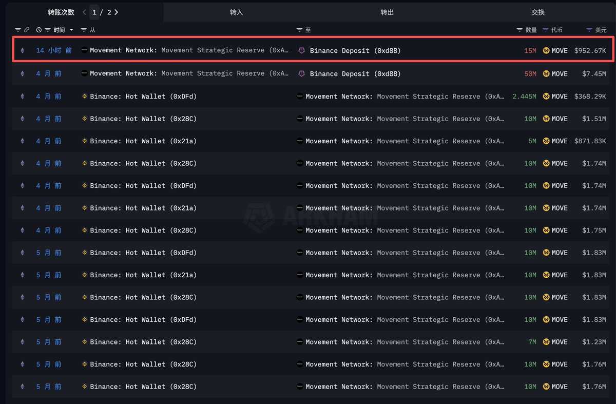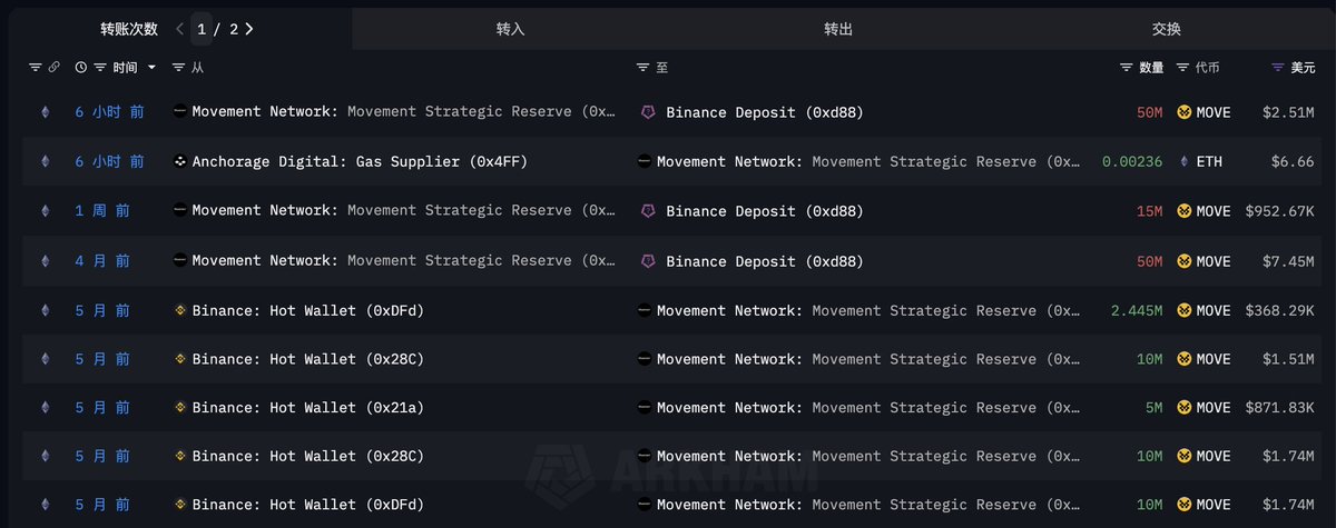 6 小时前,Movement 又把 5000 万枚此前回购的 $MOVE ($251 万) 转进了币安。