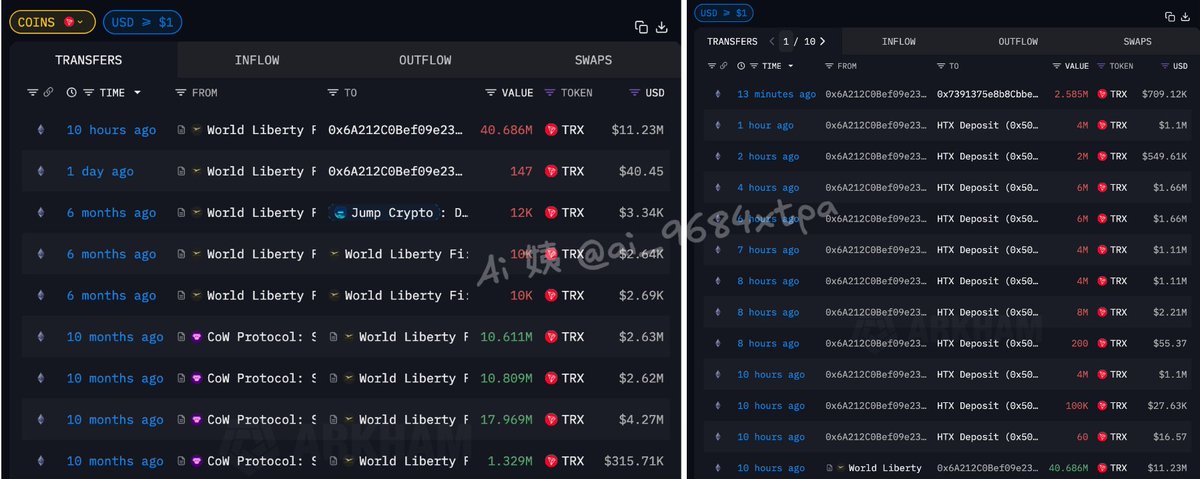 有意思,总统严选 WLFI 此前购入的 4071 万枚 $TRX 过去 10 小时已充值进 #HTX,用途未知🤔