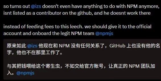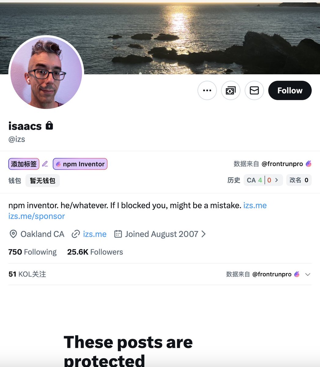 @izs 这哥们 09 年发明 npm,在 Node.js 生态干了 12 年,npm 被 GitHub 收购后他继续维护着 node-tar 这些核心库,全球几百万 JS 开发者每天都在用他写的代码。