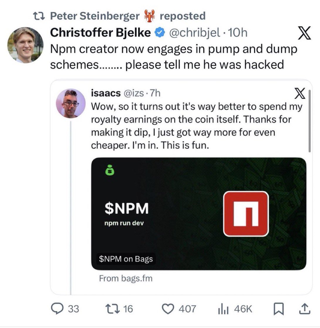 Isaac 在开发者圈子里的声望是实打实的。 $NPM 实际上是用 Crypto 的流动性溢价来支付开源作者的贡献。如果这个模式在 Isaac 身上跑通了,它的天花板会比其他 meme 高一些,因为它带有实际的行业变革意义。