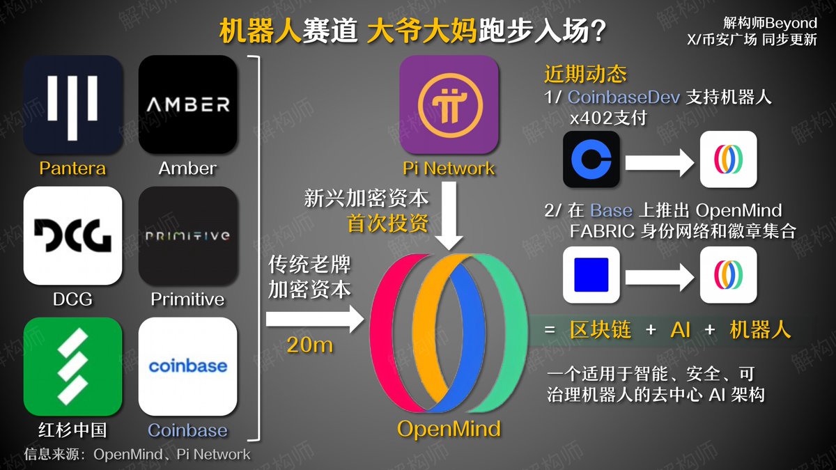 看完 @0xBeyondLee 做的图,我有点风中凌乱了! Pi Network 投资了AI赛道的 OpenMind,而我竟然还觉得投的很牛逼 😂—— 以 Pi 币恐怖的用户量级,都去下载Openmind app,走路跑步运动撸积分,感觉很快就能推动OpenMind获得巨大的流量效应。 好吧,我可能要稍微改变一下我的认知了: 这团队的商业化思路太牛逼了 钱是钱,流量是流量。 Pi是Pi,大妈Pi是大妈Pi! 不知道我的Tony老师知道这个消息了是什么反应,下次去探探……