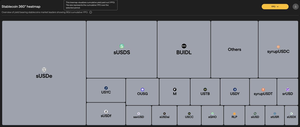 Stablewatch提出了一个新指标叫做YPO (yield paid out),用来衡量一个稳定币的收益支付能力,这个指标很有意思,如果说APY是对未来收益的预测,那么YPO是已经真实产生的收益结果。 这个统计中,Ethena $sUSDe 累计支付超过4亿美金,领跑所有稳定币,也就是说,它扛下了本周期大部分的DeFi矿工收益。
