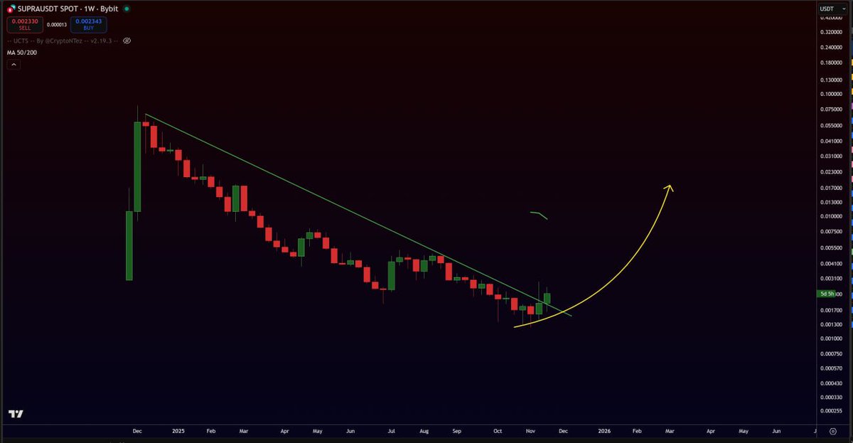 $SUPRA IS BREAKING OUT ON WEEKLY TIMEFRAME $SUPRA IS A HIGH-PERFORMANCE MULTIVM L1 BLOCKCHAIN BACKED BY COINBASE VENTURES & HTX VENTURES FROM THE TA PERSPECTIVE, $SUPRA BROKE OUT OF A FALLING WEDGE AT THE BOTTOM ANYONE HOLD $SUPRA ?