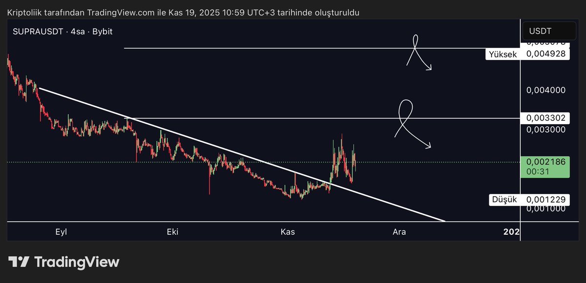 $SUPRA 4h 👀 Teknik olarak; Minörde oluşan düşen trend kırılımı gerçekleşti. Formasyon gereği kırılım sonrası bir akümülasyon ardından #Bitcoin bozmadığı sürece yükseliş beklenir. Temel olarak ise; MoveVM ve EVM ‘yi çalıştıran temelde kullanışlı bir blokzincir olması uzun vadede fiyata olan talebi doğal yollu arttırmaya fayda sağlıyor. Ayrıca Supra dünyanın en hızlı paralel EVM’si olduğunu söylüyor. Hatta bu konuda o kadar iddialılar ki bizi geçene 1m $ ödül vereceğiz diyorlar. Son olarak Mexc Bybit ve Kucoinde listeli.
