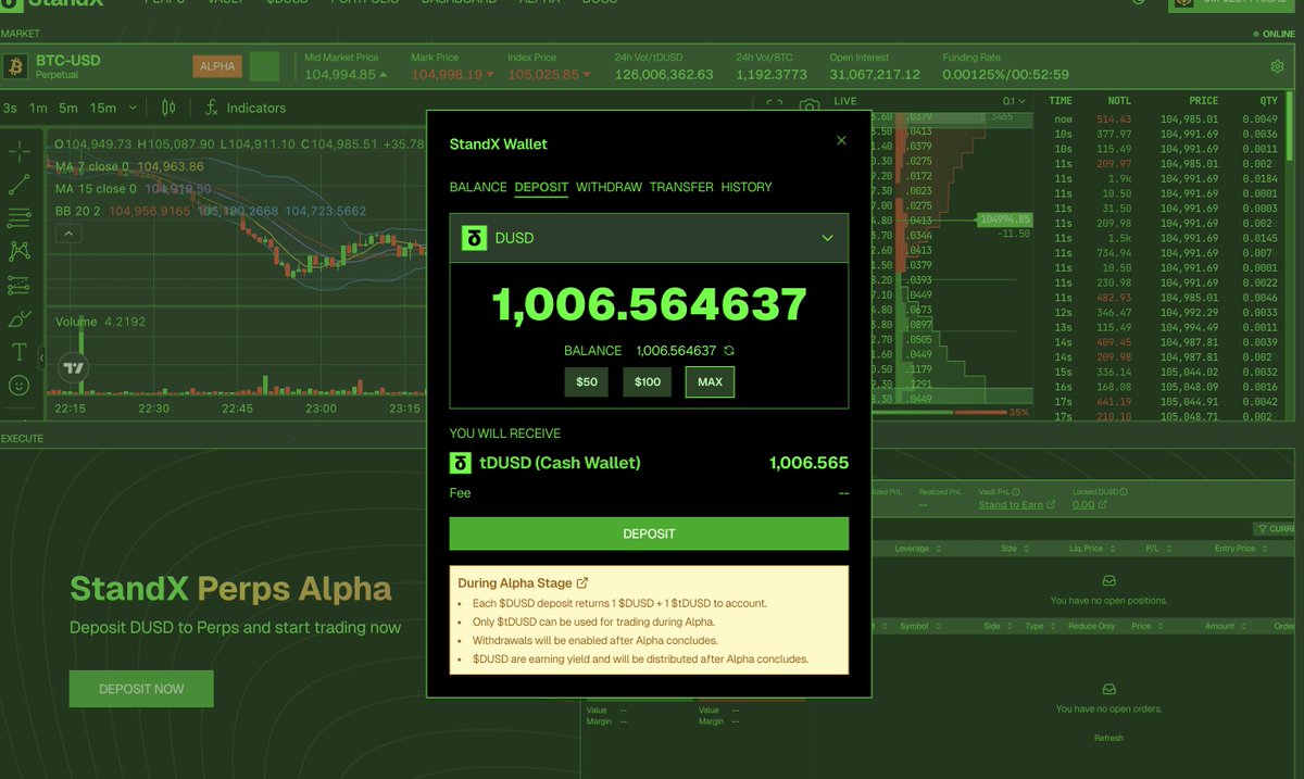 StandX @StandX_Official 主网已上线,现在可在 BNB 和 Solana 链上真金白银交易Perps 并自动获得 $DUSD 的收益作为保证金。