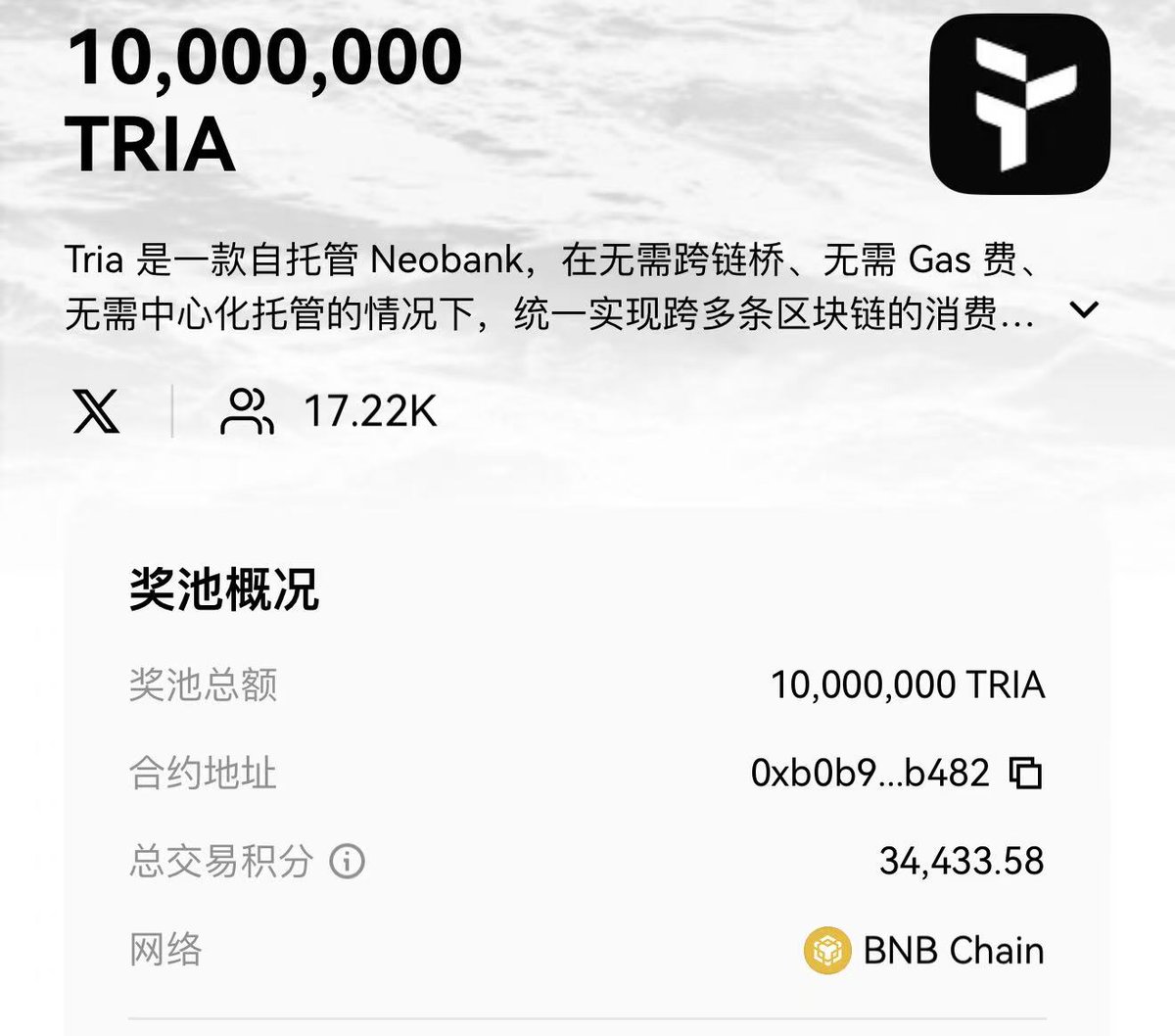 奖池1000万 $TRIA ,目前1.78万分。按照上一期3.2万分算的话,1分也能瓜分300多个。