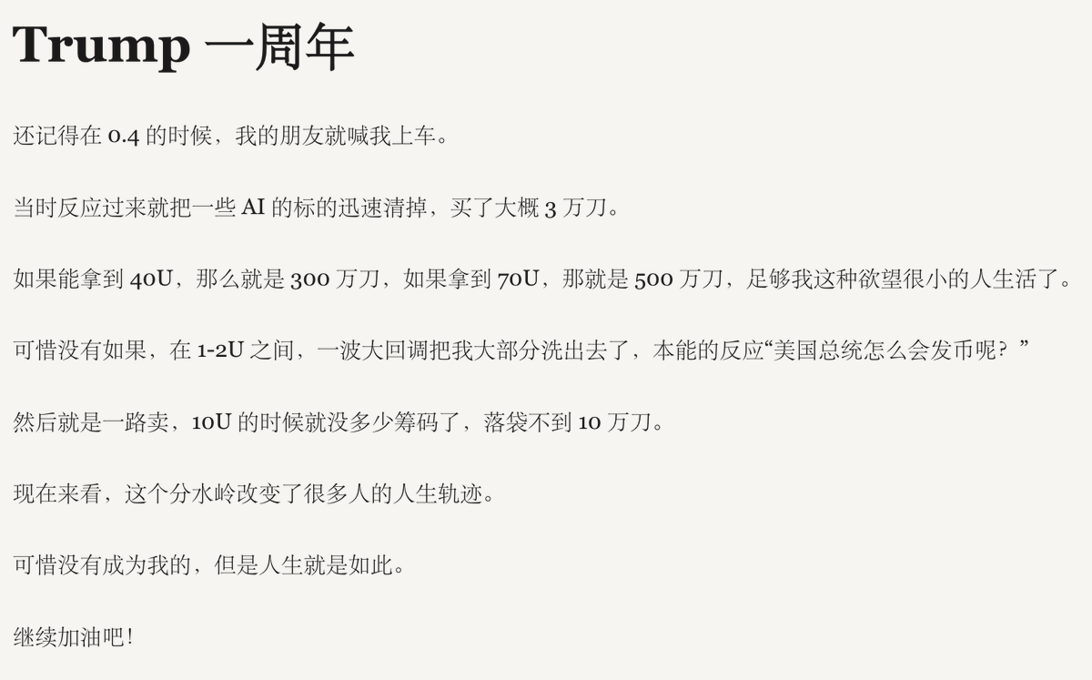 川普发币一周年,很多人在去年今日因为 $TRUMP 暴富,也有很多人在去年今日持有其他币被疯狂吸血。 我属于后者,还在后面的AI泡沫中损失惨重,并没有过上好年。 特朗普上台前以为他是web3的救世主,后来才发现他是来币圈取钱的。 你这一年过得怎么样?是否因为川普改变了人生K线?