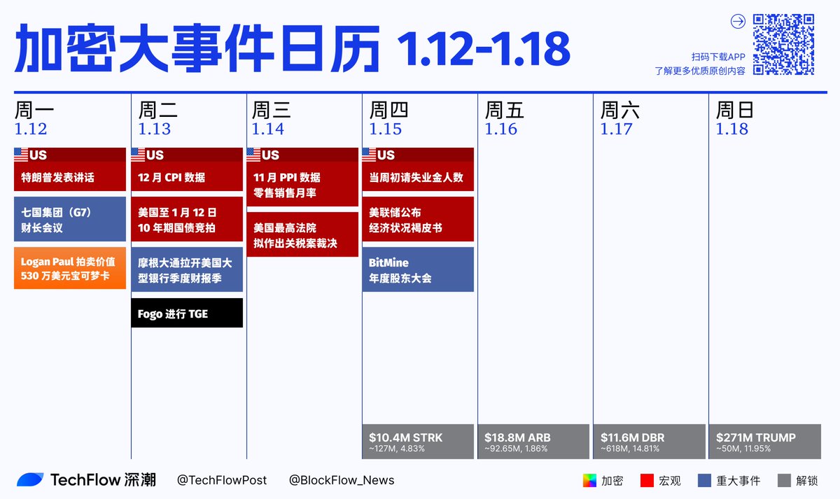 🌐 1月12日 - 1月18日|本周大事件 📅 1 月 12 日|星期一 🔵 美国总统特朗普发表讲话(08:15) 🔵 七国集团(G7)财长会议 🔵 Logan Paul 拍卖价值 530 万美元宝可梦卡 📅 1 月 13 日|星期二 🔵 美国 12 月 CPI 数据 🔵 美国至 1 月 12 日 10 年期国债竞拍 🔵 摩根大通拉开美国大型银行季度财报季 🔵 Fogo 进行 TGE 📅 1 月 14 日|星期三 🔵 美国 11 月零售销售月率 & PPI 数据 🔵 美国最高法院预计将作出关税案裁决 📅 1 月 15 日|星期四 🔵 美国至 1 月 10 日当周初请失业金人数 🔵 美联储公布经济状况褐皮书 🔵 $STRK 将于 1 月 15 日解锁 1.27 亿枚代币,价值约 1040 万美元,占流通量 4.83% 🔵 BitMine 召开年度股东大会 📅 1 月 16 日|星期五 🔵 $ARB 将于 1 月 16 日解锁 9265 万枚代币,价值约 1880 万美元,占流通量 1.86% 📅 1 月 17 日|星期六 🔵 $DBR 将于 1 月 17 日解锁 6.18 亿枚代币,价值约 1160 万美元,占流通量 14.81% 📅 1 月 18 日|星期日 🔵 $TRUMP 将于 1 月 18 日解锁 5000 万枚代币,价值约 2.71 亿美元,占流通量 11.95%