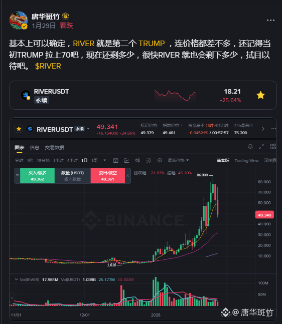 怎么样兄弟们? 老唐1.29日说 $RIVER 就是第二个 TRUMP ,而且会连价格都差不多,说的没错吧?昨天已经扎到10U边上了,差点变个位数,这一路从7、80跌下来,比 $TRUMP 还特么血腥啊!可惜当初老唐74U开的空单没拿住啊,否则要多赚很多条华子了。