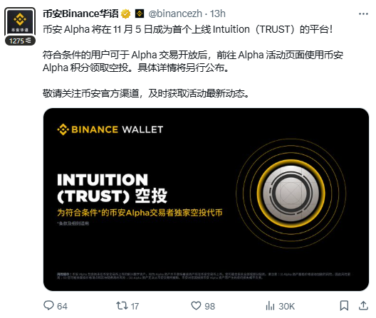 Intuitio 代币 $TRUST 也即将在 11月05日 上线币安Alpha和合约板块