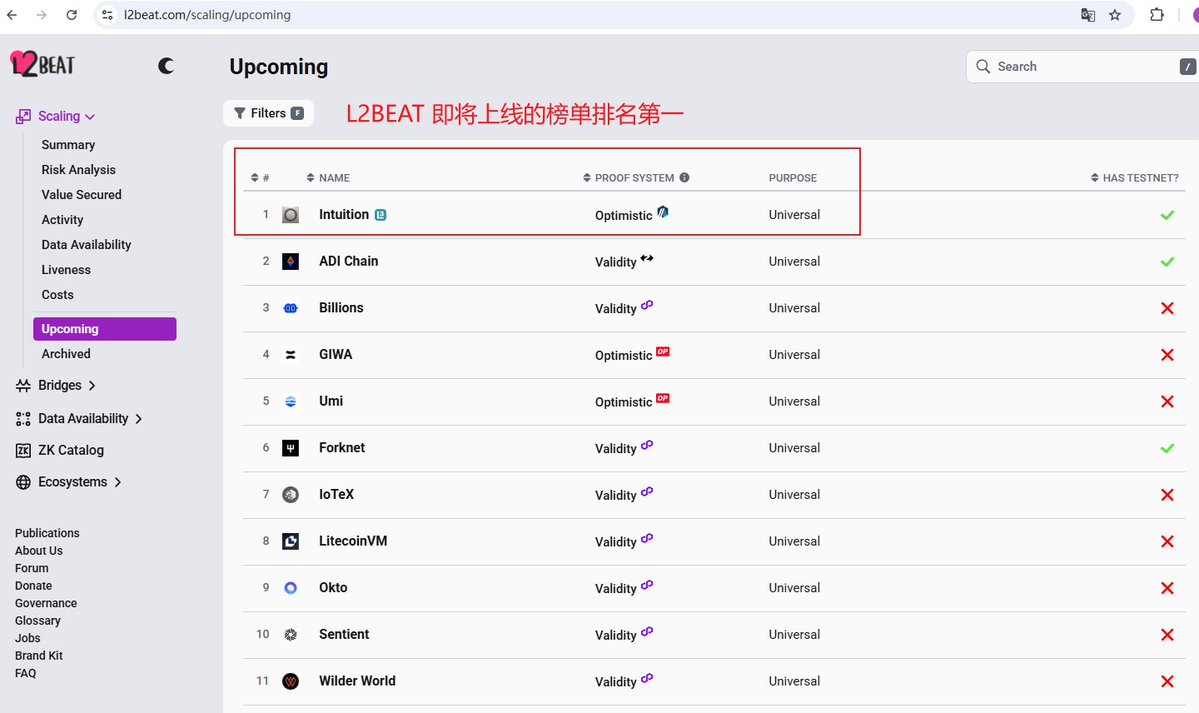 中文区不火,但是在 L2Beat 的“即将上线”榜单中,Intuition 排第一: