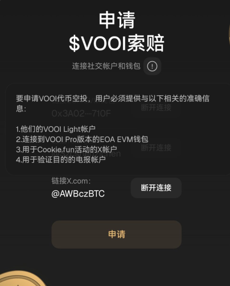 Vooi @vooi_io 空投注册 为了确保顺利统一的 $VOOI 索赔流程,大家需要提前申请,只有成功关联并提交申请的参与者才有资格获得赔偿