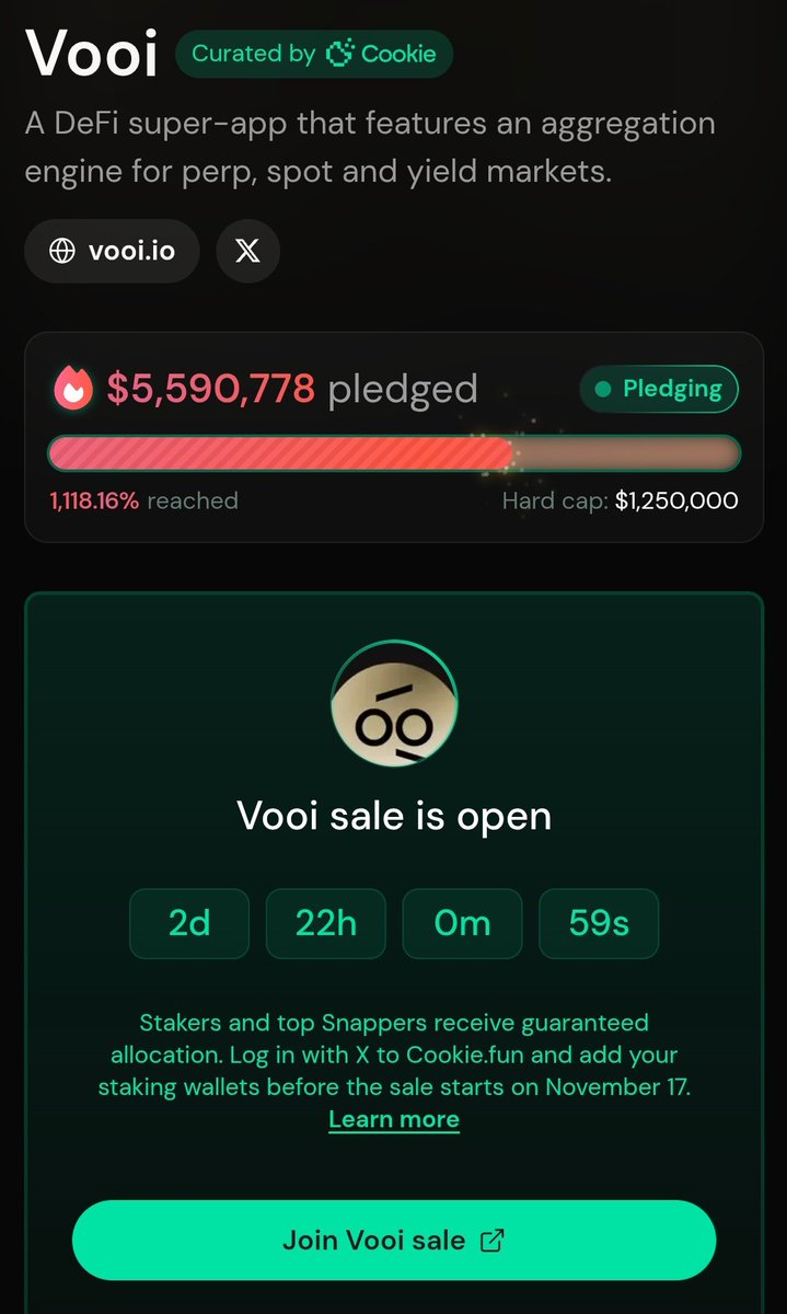 参加了下,超募2000%+了。 希望能给寒冷的冬天带来点温暖吧😭。 perp dex已经证明了可以,聚合的perp dex能不能就得看vooi了!