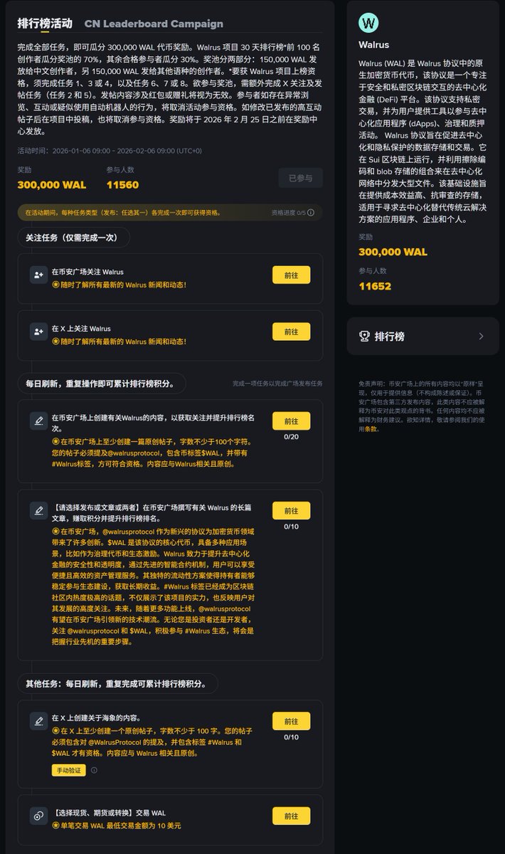 现在打开 X 首页,放眼望去基本都是各种“嘴撸文”。你别说,收益确实不低——前阵子 @brevis_zk 的空投、@zama 的 NFT,基本上人均上千 U。但问题也很明显:AI 文鱼目混珠、KAITO 排名不透明,反而把嘴撸这件事搞得越来越卷、越来越难。 也正因为这样, Binance @binancezh 广场对 CreatorPad(创作任务台) 做的这次升级,优势就更明显,核心变化就一句话: 用积分制,正式取代了过去偏曝光、偏情绪的 Mindshare 总榜,规则变得更透明。 现在逻辑很简单: 你每天的积分 = 内容质量 + 有效互动 + 真实交易量。 积分、排名、来源一目了然,你能清楚看到自己差多少,从而能更精准的调整策略,提升个人名次,获得更多积分! 更重要的是,这次不只是怎么加分,对低质量内容、灌水、互刷,直接引入扣分和举报机制。完美避开嘴撸互动,为了刷分而互动的行为,对于AI文章还能一键举报——对真正做原创的人来说,算是实打实的利好。 而且参与步骤在后台也简单明了,比如后台正在进行的 Walrus 排行榜活动,完成指定任务即可参与 300,000 $WAL 奖池分配:前 100 名创作者瓜分 70%,其余合格参与者瓜分 30%,步骤清晰简单,按照提示一步一步来就行。 这次Binance 广场对 CreatorPad(创作任务台)改版的本质,并不是让大家更卷,而是把 长期交易 + 长期输出”这两件事,真正绑在了一起。 如果你本来就一直在交易、在复盘、在认真输出,快来币安广场领钱!~