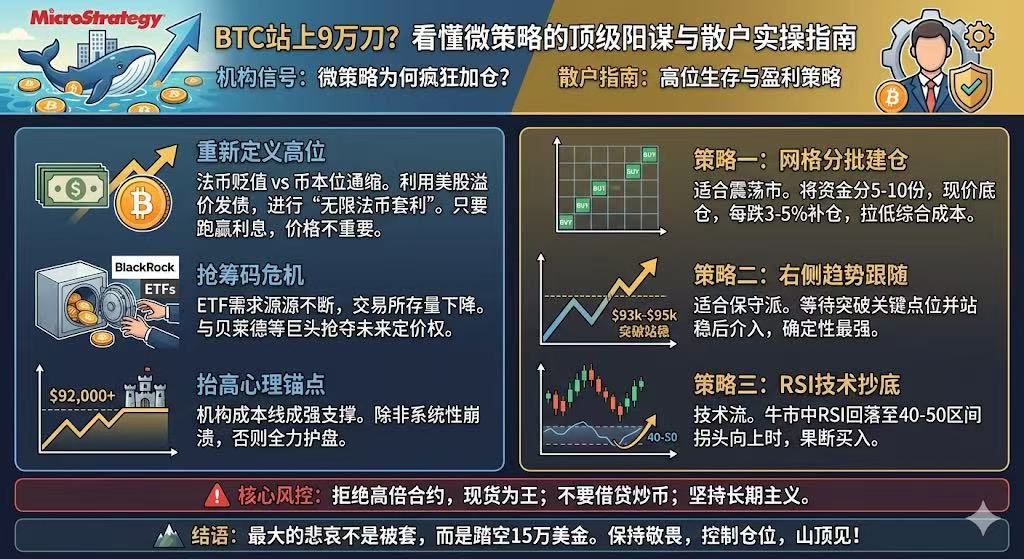 BTC站上9万刀太贵不敢买?看懂MicroStrategy这波“高位增持”的顶级阳谋 看着比特币价格在 $92,533 徘徊(数据参考近日行情),很多兄弟的心态崩了:“太高了,等回调再买吧。” 结果越等越高,只能目送。 但就在此时,美股上市公司持有BTC最多的“巨鲸”——MicroStrategy (微策略,代号MSTR) 再次披露增持。 很多人看不懂:为什么迈克尔·塞勒(Michael Saylor)敢在所谓的“高位”几十亿美金地往里冲?是他疯了,还是我们还没看透这轮周期的本质? 今天这篇文章,不谈信仰,只谈逻辑。我们将深度拆解机构的操盘思维,并手把手教你在当前行情下,如何制定属于散户的“生存与盈利策略”。 一、 深度解析:为什么微策略敢在 $9W+ 疯狂加仓? 散户看价格,机构看结构。微策略的增持行为,实际上向市场释放了三个极其强烈的信号: 1. 重新定义“高位”:法币本位 vs 币本位 我们觉得 $92,533 贵,是因为我们在用美元(USDT)衡量比特币。但在微策略的资产负债表逻辑里,美元是注定长期贬值的资产,而比特币是唯一的“通缩硬通货”。 他们利用美股的高溢价发行债券(借钱),用借来的即将贬值的美元,去购买稀缺的比特币。这就是塞勒的“无限法币套利”模式。对他们来说,只要比特币的年均涨幅跑赢债券利息,买入价格是多少根本不重要。 2. 抢筹码:流通性枯竭危机 ETF通过后,华尔街对BTC的需求是源源不断的。但交易所里的BTC存量正在以肉眼可见的速度下降。微策略现在的疯狂买入,是在和贝莱德、富达以及未来的国家主权基金抢夺有限的流通筹码。 结论: 机构买入不是为了赚20%的波段,他们是在锁定未来10年的资产定价权。 3. 抬高心理锚点 当最大的庄家在 $92,000 成本线大举买入时,这个价格就成了机构眼中的“强支撑位”。这意味着,除非发生系统性金融崩溃,否则机构会不惜一切代价护盘,因为这关乎他们的股价生存。 二、 散户困局:现在还能进场吗? 我知道大家现在最纠结的是:“道理我都懂,但万一我一买就崩盘怎么办?” 这里必须认清一个现实:在这个阶段,试图“空仓等暴跌”的风险,已经大于“被套”的风险。 因为机构正在用资金筑底,踏空的代价是由于法币贬值带来的购买力永久丧失。 但是,盲目梭哈也是找死。 此时此刻,你需要一套科学的建仓策略。 三、 实操指南:后续应该怎么买?(保姆级策略) 针对当前 $90,000+ 的高位震荡行情,切记不要用“赌徒心态”去开百倍杠杆,请参考以下三种稳健策略: 1. 策略一:网格分批建仓法(适合波动市) 不要指望买在最低点。当前市场在历史高位附近震荡,最适合分批进场。 操作: 将你的闲置资金分成 5-10 份。 执行: 现价买入 20% 底仓。每下跌 3%-5%,补仓 10%-15%。 逻辑: 这样你的综合持仓成本会始终低于市场均价。即使发生插针回调,你手里还有子弹,心态不会崩。 2. 策略二:跟随趋势的“右侧交易”(适合保守派) 如果你害怕假突破,可以等待确定的信号。 关键点位: 关注 $93,000 - $95,000 的突破情况。 操作: 如果日线级别强势站稳前高,且伴随成交量放大,说明上方抛压已被吃尽。此时进场虽然成本稍高,但确定性最强,是典型的“追涨(趋势)杀跌(止损)”战法。 3. 策略三:RSI 抄底战法(技术流) 指标: 打开日线或4小时线图,关注 RSI 指标。 信号: 在牛市中,当 RSI 回落至 40-50 区间时,往往是阶段性的回调底部(机构洗盘结束)。 操作: 一旦 RSI 触及低位并出现拐头向上,果断买入。 四、 风险提示与资金管理(必读) 在币安广场分享,必须要对大家的本金负责。无论机构怎么买,作为个体投资者,以下几条铁律必须遵守: 拒绝高倍合约: 机构现货买入可以抗住 50% 的回撤,你开 20 倍合约,5% 的波动就让你归零。在历史新高附近,插针清杠杆是常态,现货为王。 不要借贷炒币: 微策略能发债买币是因为他们有上市公司背书,现金流充裕。散户千万不要通过借贷、抵押房产来在这个位置博弈。 长期主义: 如果你买入是为了明天就翻倍,那你大概率会亏损离场。如果你是看好未来两年的减半后周期和全球放水逻辑,那么现在的价格,放在两年后看,可能依然是“山脚”。 结语 MicroStrategy 的再次加仓,是给全市场的一颗定心丸。在这个市场上,最大的悲哀不是被套,而是当比特币迈向 15万、20万美金时,你手里却握着一堆不断贬值的USDT。 保持敬畏,控制仓位,跟随趋势。我们山顶见!