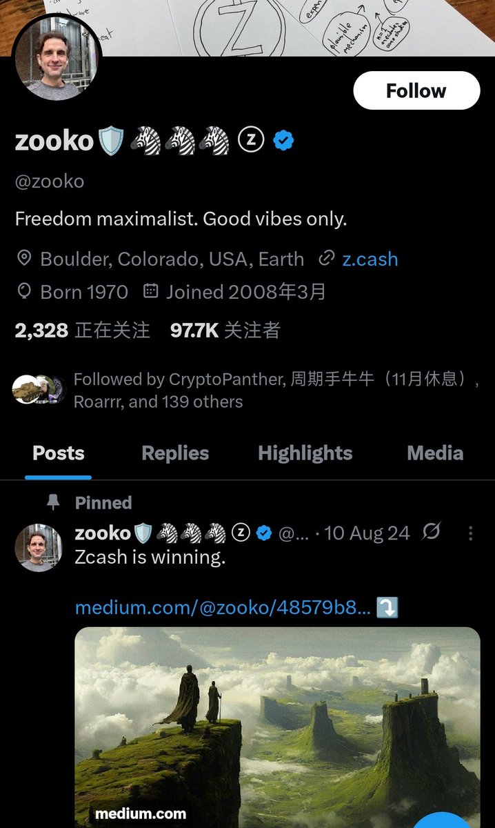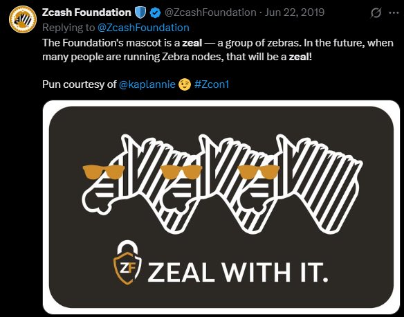 . @mineZcash 是被zec创始人 @zooko 关注的社区账号。 18年,minezcash发布的推文说选定 zeal作为吉祥物。 zooko推特后缀有斑马🦓🦓🦓后缀。 所以大概率,zec的吉祥物就是这个zeal。 叙事解释清楚了。 $zeal 是zec的吉祥物。