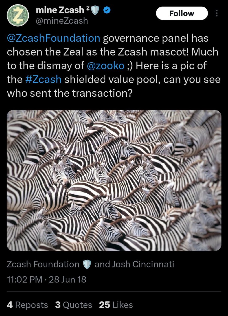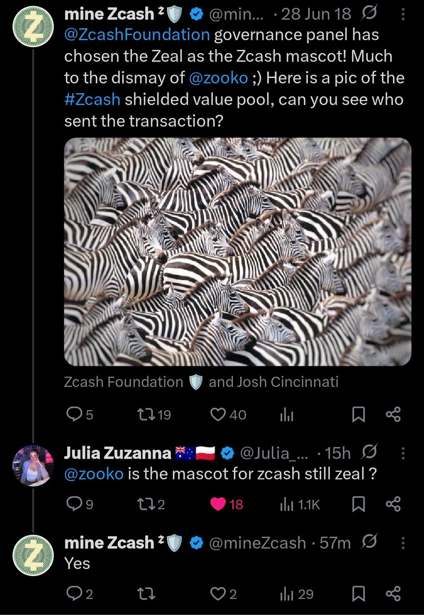 $ZEAL 2WqVhLrfNbvB9stY4QbZ1182fo1n8JGa5jVJJ1HBpump @mineZcash 是被zec创始人 @zooko 关注的社区账号。 18年,minezcash发布的推文说选定 zeal作为吉祥物。 zooko推特后缀有斑马🦓🦓🦓后缀。 所以大概率,zec的吉祥物就是这个zeal。 叙事解释清楚了。 $zeal 是zec的吉祥物。