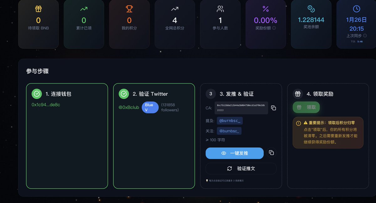 3️⃣ Tweet-to-Earn:推文宣传赚积分,链上领 BNB(10% 税收)