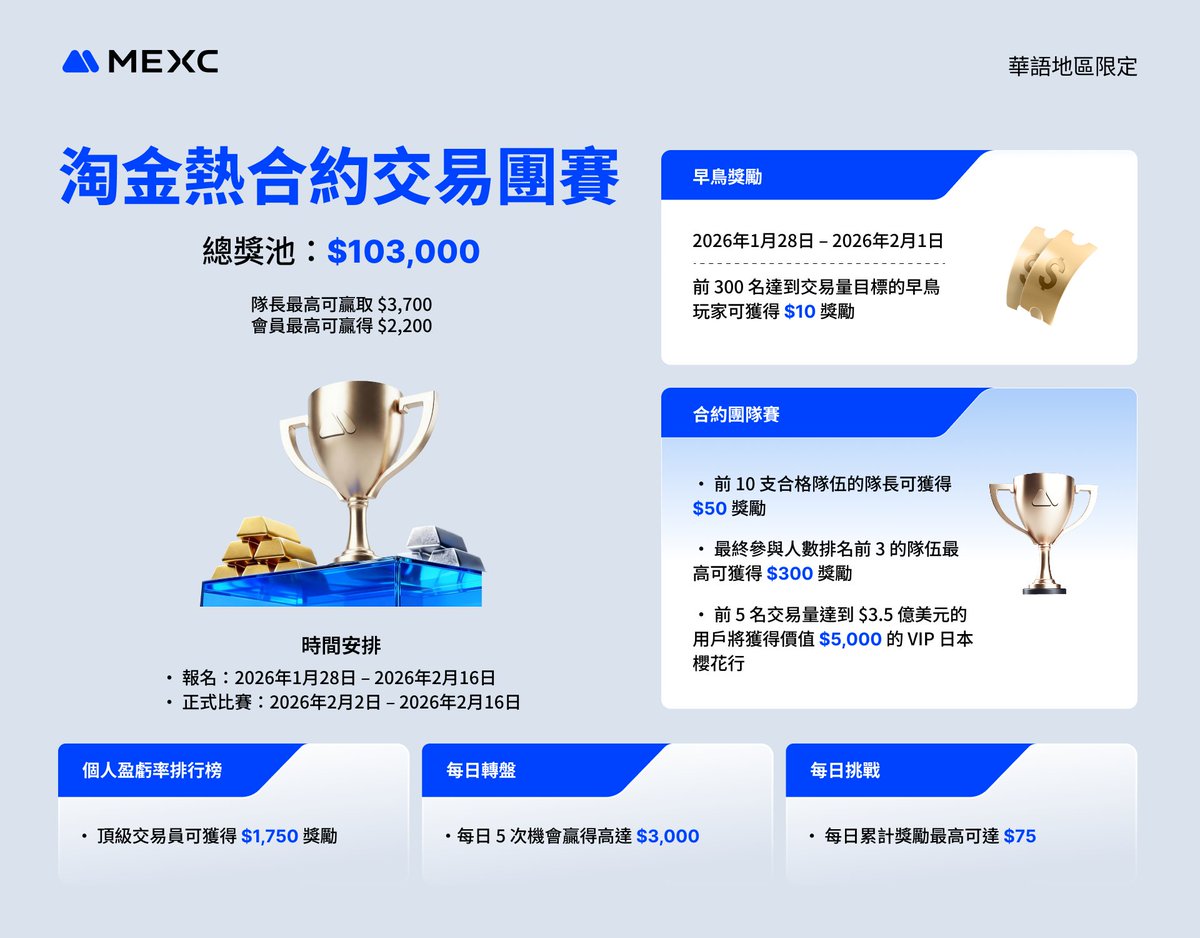 看到 MEXC 這次針對華語區搞了個「淘金熱」團賽,獎池 103,000 U 還算有誠意。最騷的是這個「一魚四吃」的機制:刷一份交易量,能同時拿 衝關獎 + 轉盤 + 交易額排名 + 盈利率排名。