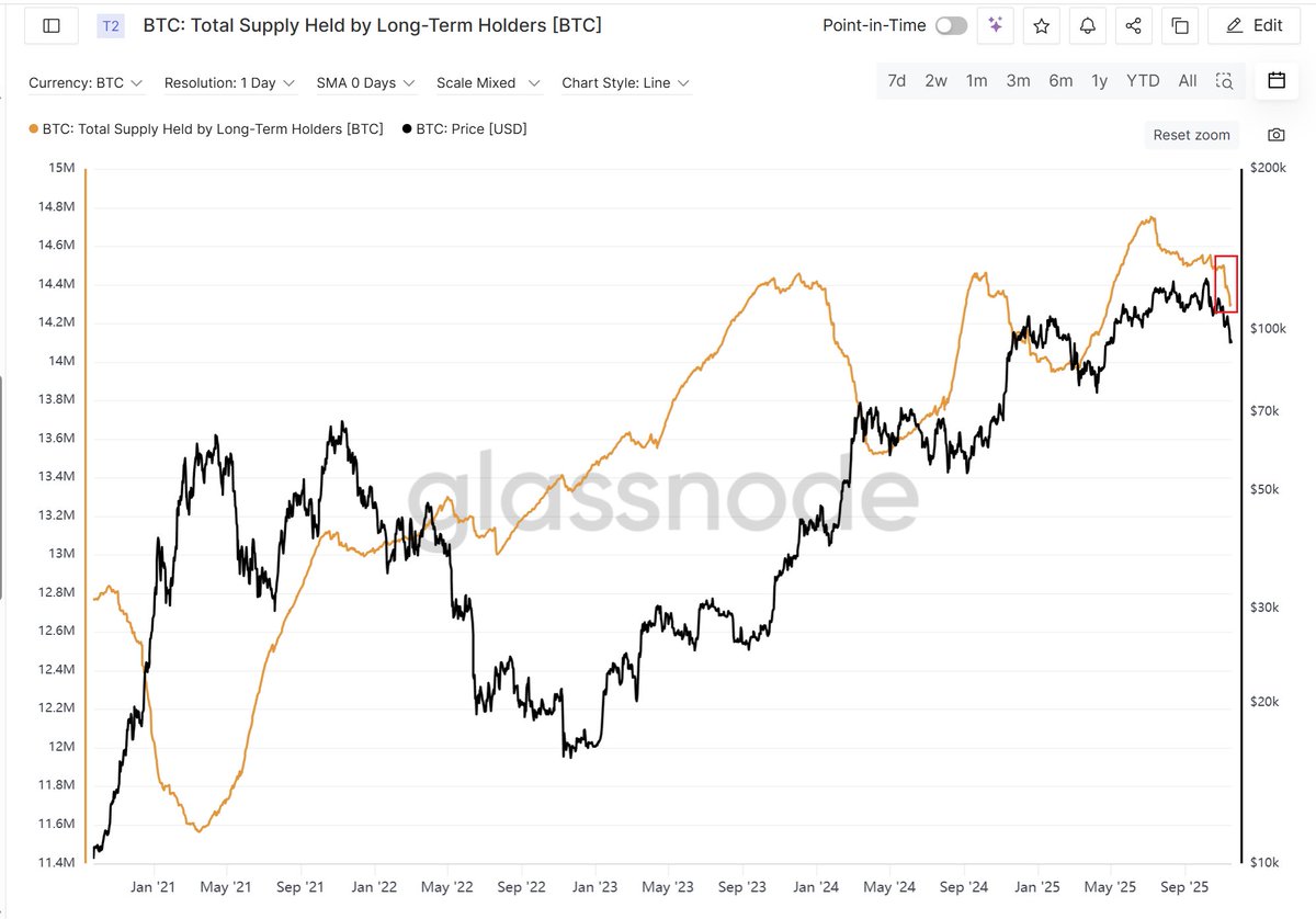 近期长期持币者(持币>约半年)筹码数量与 #BTC 价格同步下降,这种情况是非典型的👇