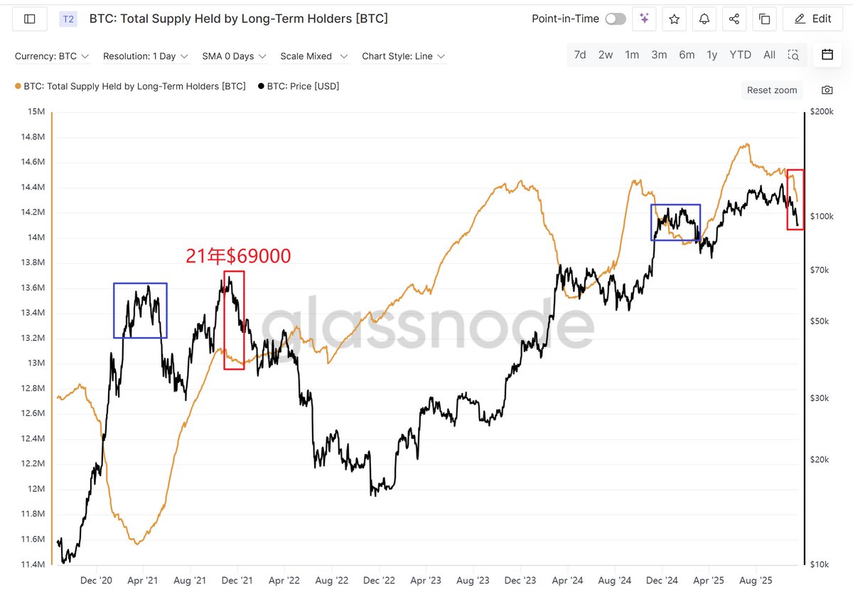 无独有偶,历史上21年$69000高点后长期持币者筹码数量也跟币价同步下跌👇
