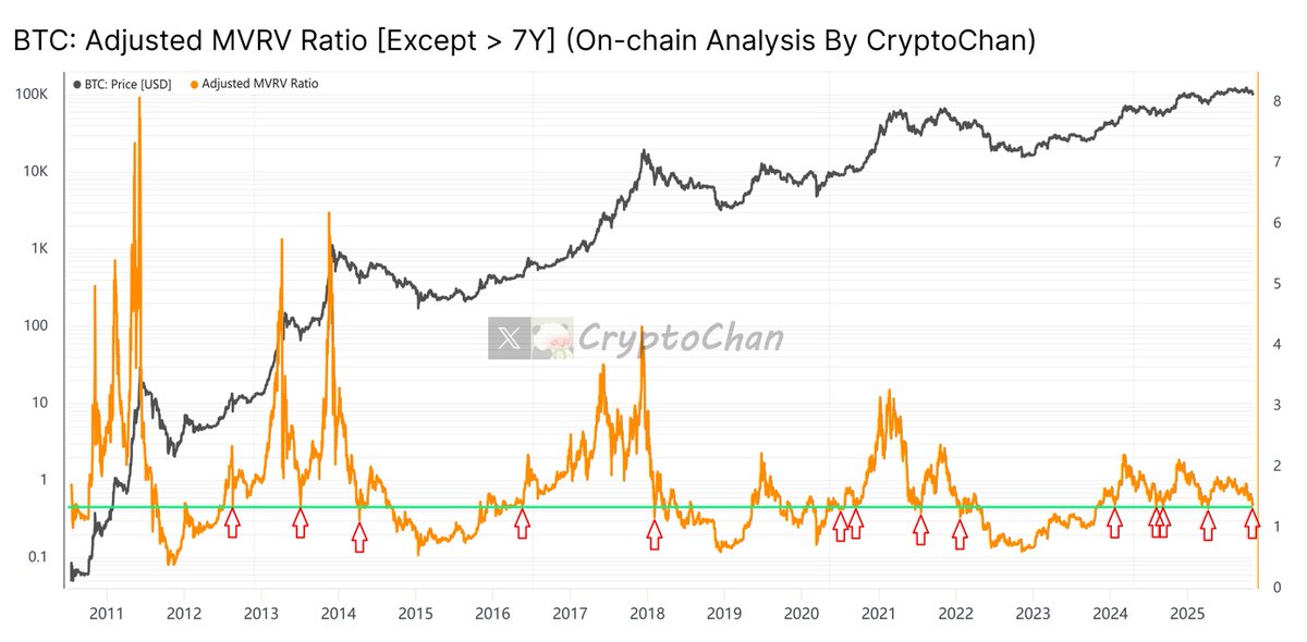 图中指标为比特币 MVRV(修改版,将链上超过7年未移动过的BTC剔除)