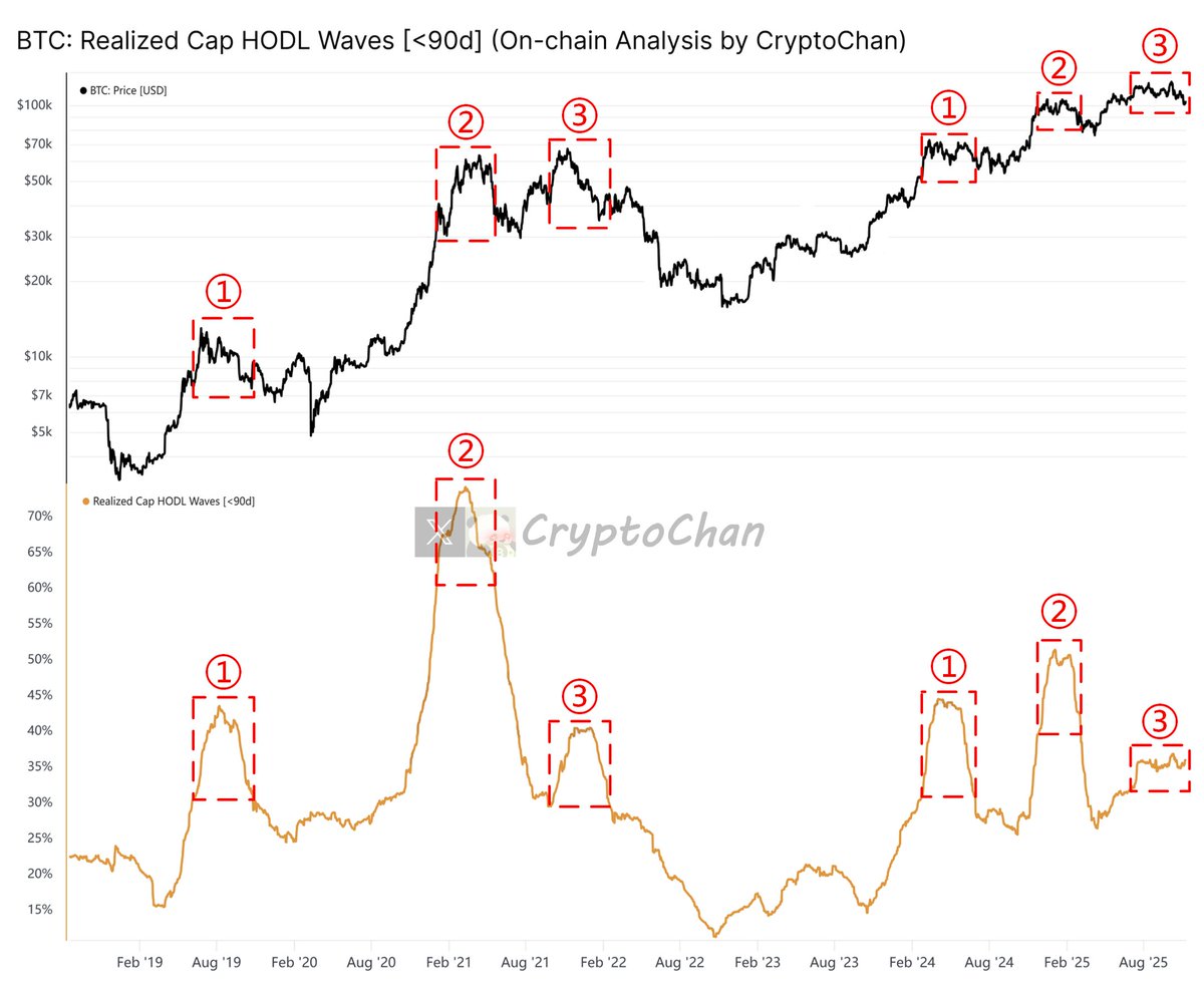 图中上方指标为 #BTC 价格;下方指标为 #BTC: Realized Cap HODL Waves [<90天]