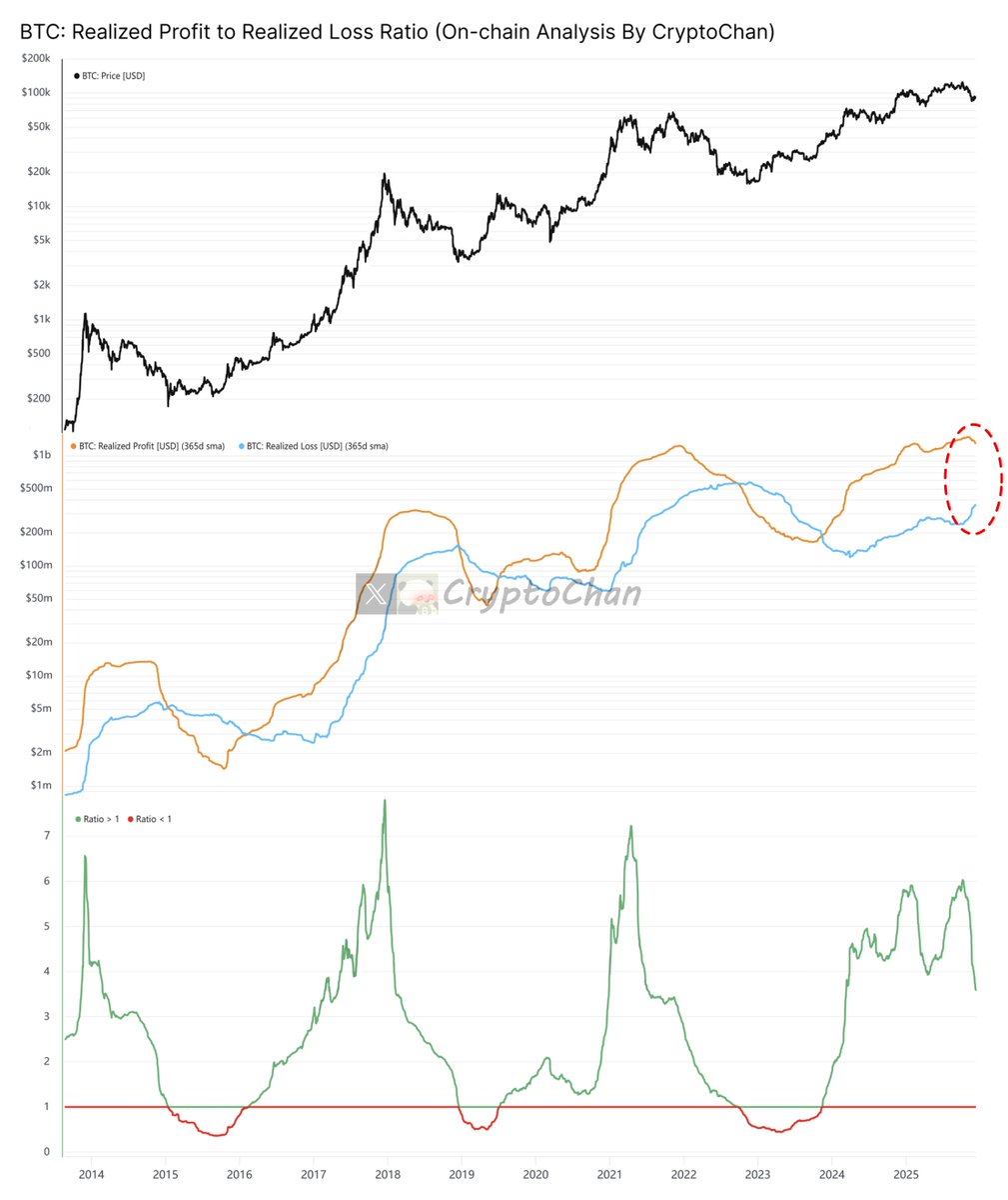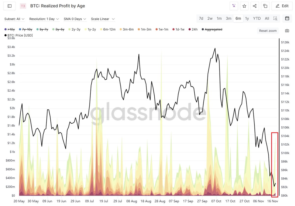 值得注意的是链上盈利的筹码在币价跌破 $100,000 的过程中保持得相对克制,然而在币价跌破 $90,000 后也有点小破防了。如下图所示,在币价跌破 $90,000 后,链上持币3年内的筹码出现较高的止盈金额👇