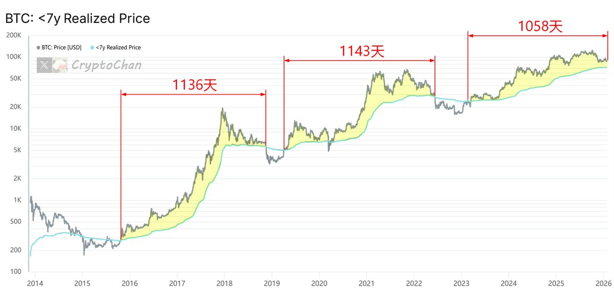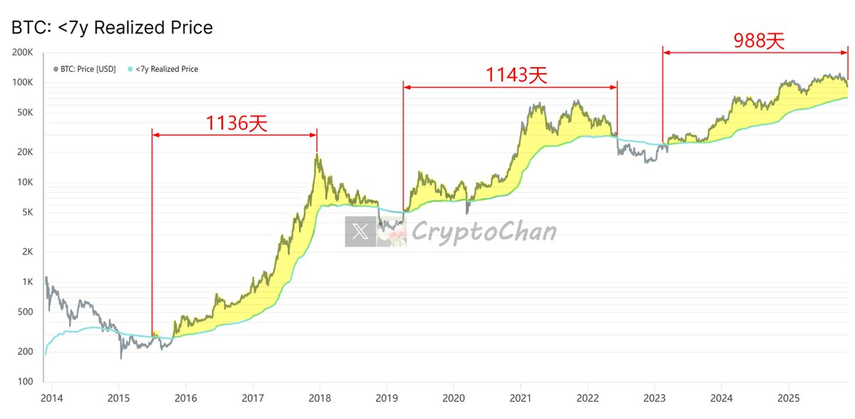 BTC: Realized Price 是一个链上指标,计算时排除那些持有时间超过7年的比特币(这些币往往被视为极长期持有、失落或不活跃的供应,不会轻易进入市场流通)