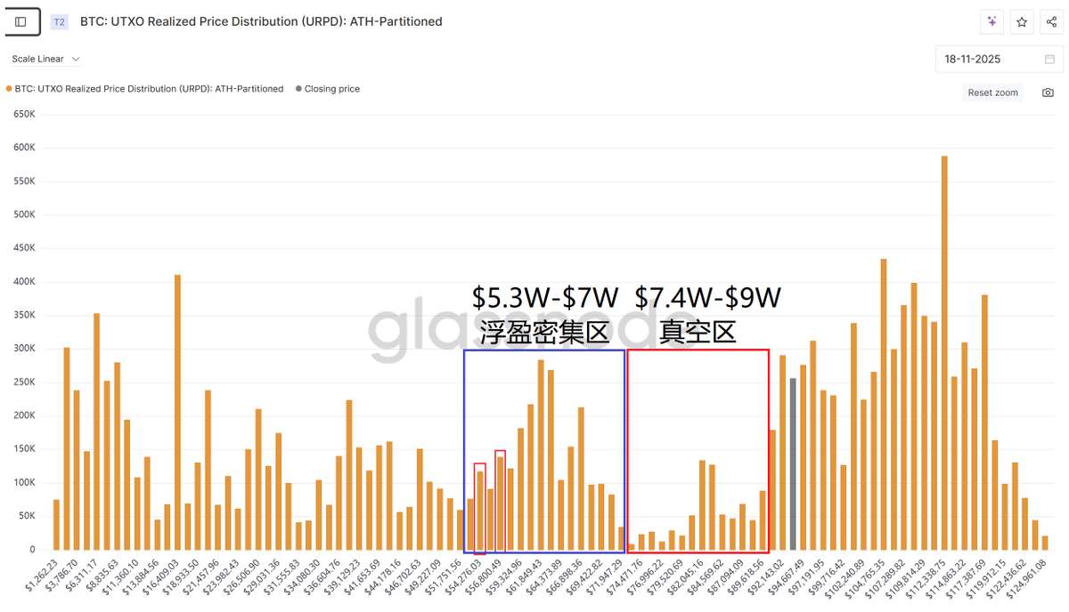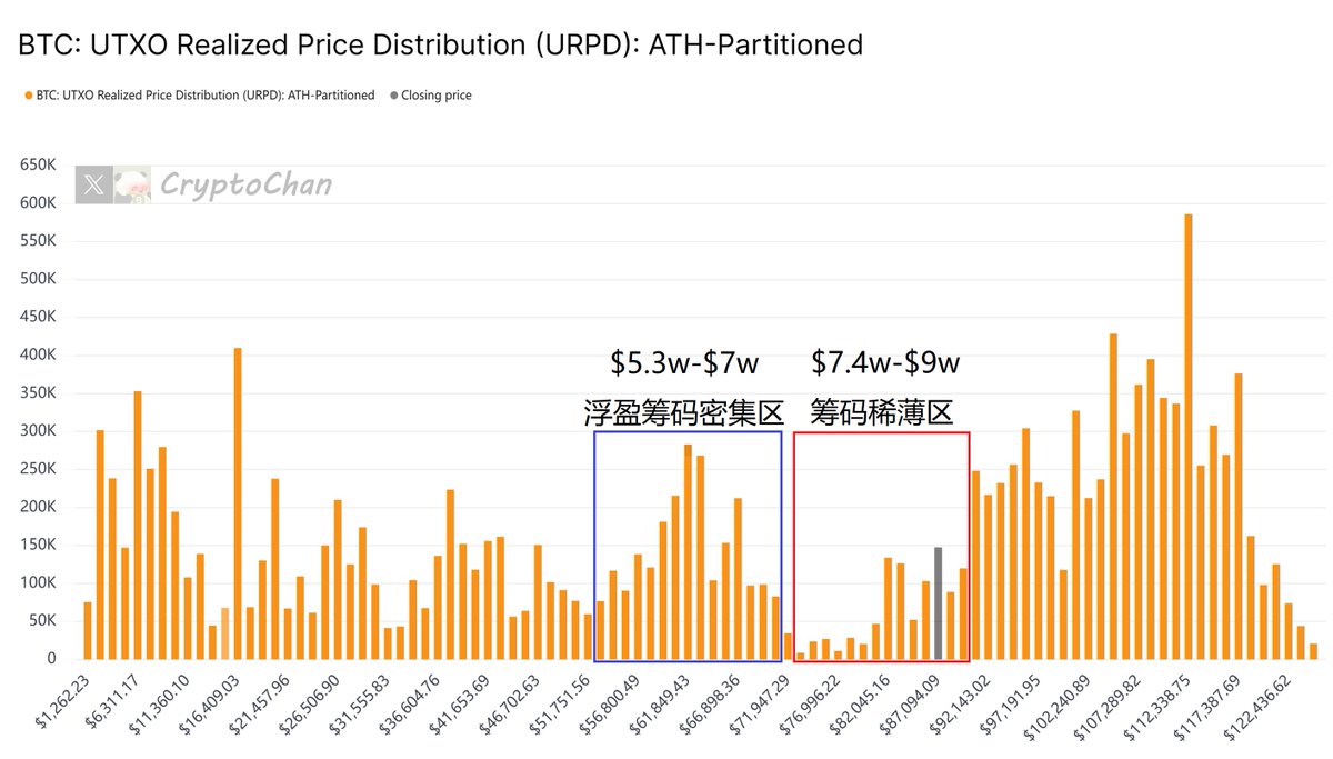 目前在 $7.4w-$9w 的区间存在筹码真空区,这意味着币价若从 $9w 下行的阻力相对薄弱。这个真空区间应该也会成为高位被套筹码大量割肉的区间,以及低位筹码浮盈密集区大量止盈的区间👇