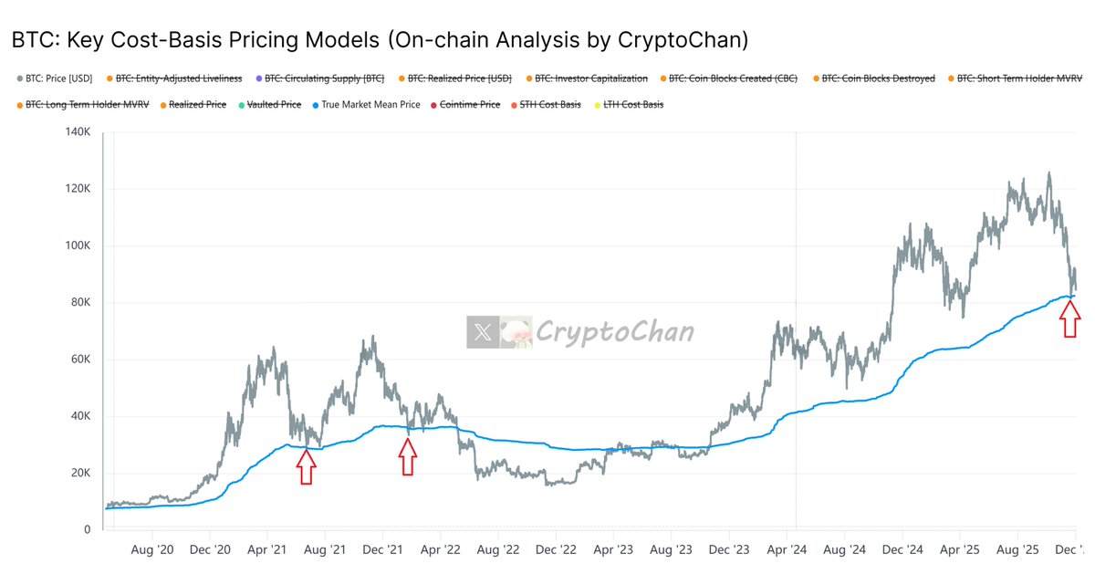#BTC 长期持有者成本均价(剔除持币>10年的筹码)指标:长期持有者(持币>155天,排除>10年)的平均入场成本,聚焦活跃长期群体,避免僵尸币扭曲。反映:长期群体盈利/亏损状态;价格高于均价时盈利,易获利了结形成上行阻力;低于时亏损,但提供下行支撑,判断熊市底部或周期转折