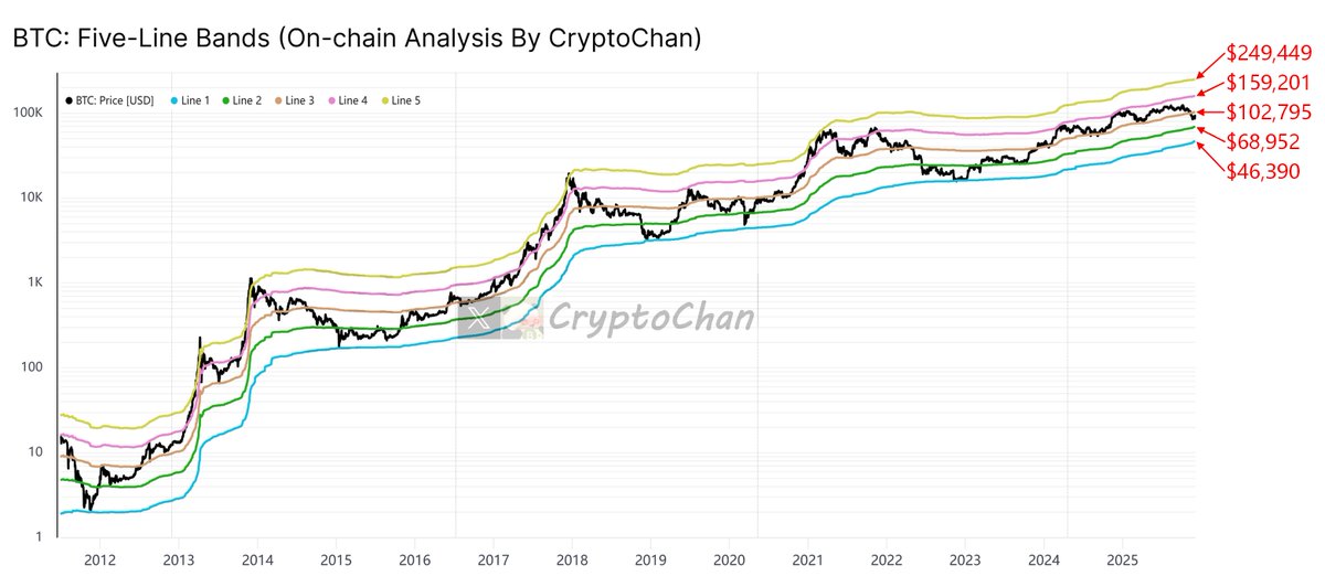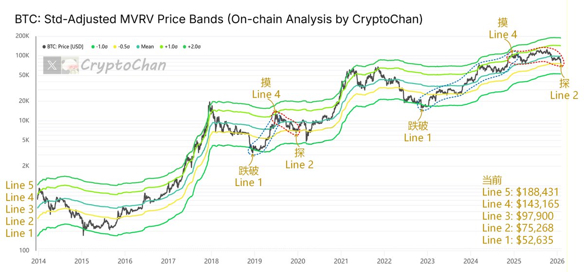 恰好手上有一个基于 #BTC: MVRV指标差开发的价格模型,该模型通过引入累积算术平均值与累积标准差,对MVRV进行统计学标准化处理,采用5条线将比特币历史价格完整囊括划分