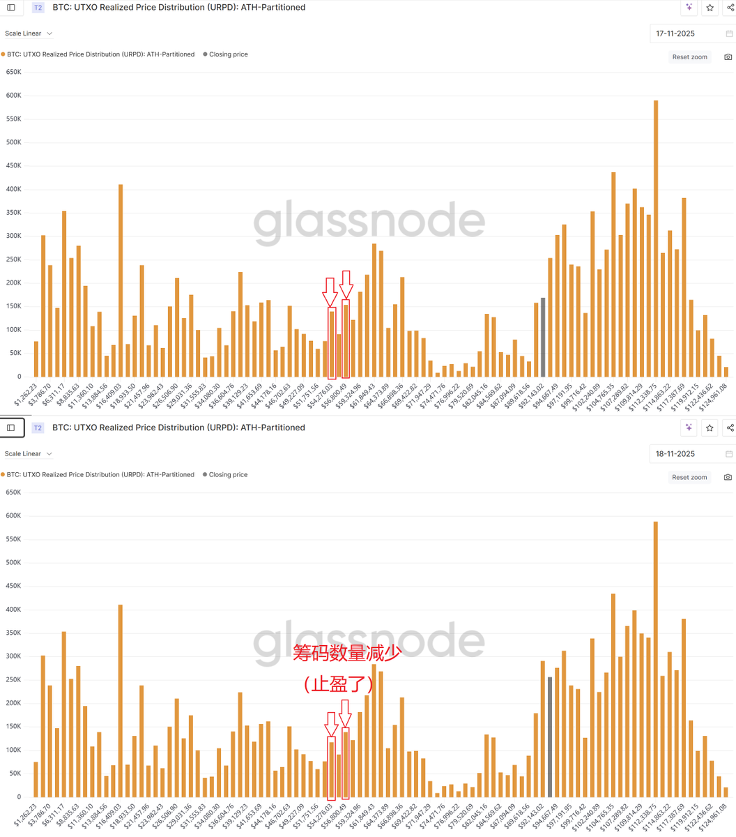深扒之后,发现是持币1-2年的投资者止盈了10余亿刀,在URPD指标中可以明显观察到在 $5.4w 和 $5.6w 附近入场的早期投资者止盈了一些👇