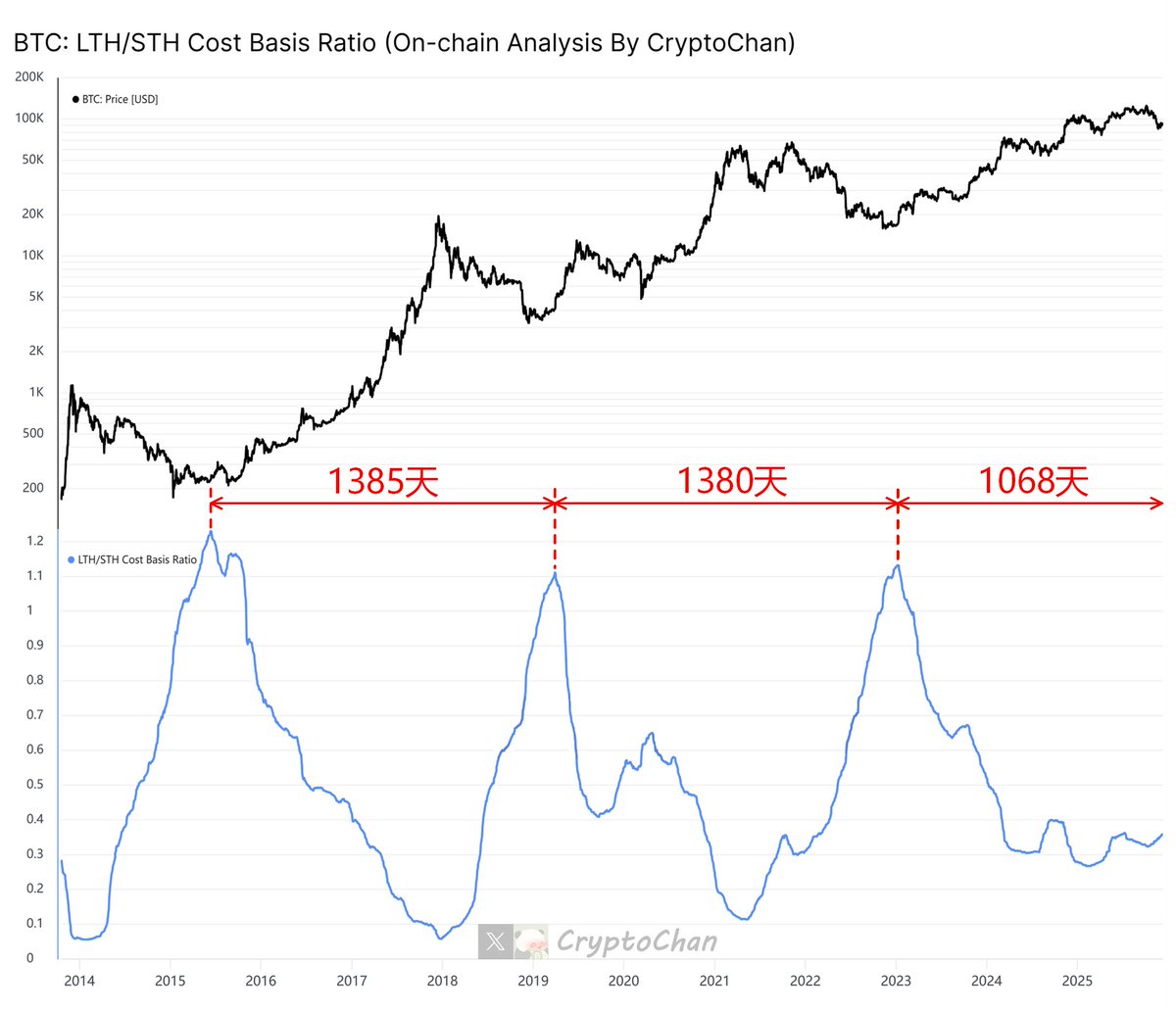 图中下方指标为“BTC 短期持有者成本均价”跟“BTC 长期持有者成本均价(剔除>10y筹码版)”之比(即:黄线 / 玫红线)