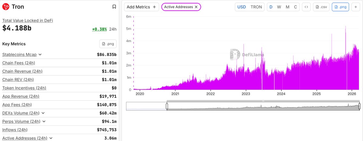 冷知识:TRON日活跃地址3.06M 排名第一