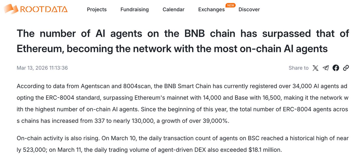从单纯的资产交易到如今 3.4 万个 AI Agent 活跃的自治生态,这不是偶然,而是整个生态共同进化的成果。看到 @cz_binance 和社区伙伴们对 AI 基础设施的坚持,数据给出了最真实的回馈:单日 $18.1M 的 Agent 交易额只是开始。