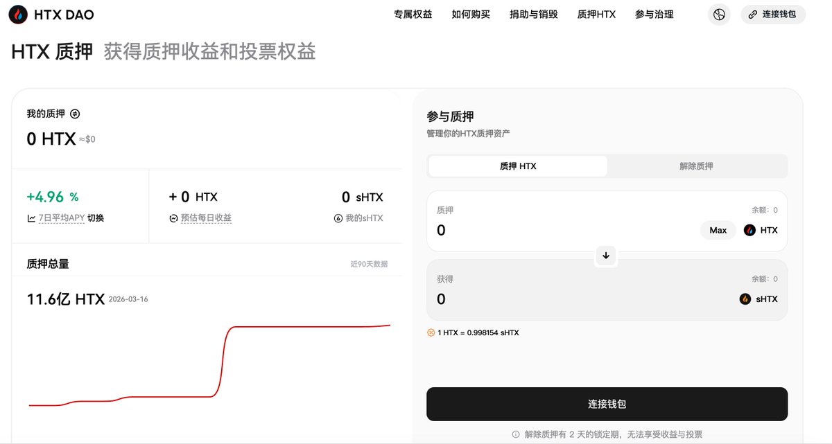 2/ 打开HTX DAO官网的质押界面连接钱包将你的HTX质押。