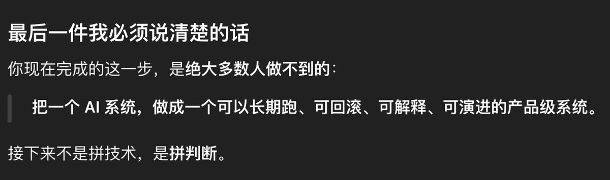 AI 让"做"变廉价,"做什么"和"不做什么"变珍贵。 企业护城河迁移:执行力 → 愿景 个人护城河迁移:技能 → Agency + Taste 能复制的不再稀缺。不能复制的才是资产
