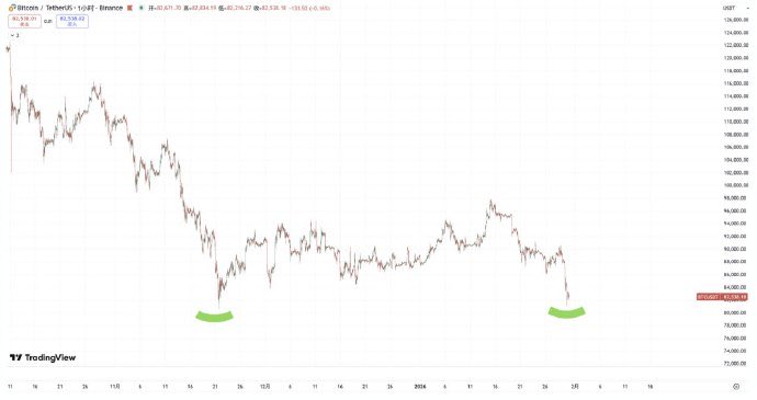 1. 如图所示,比特币暴跌到了8.1万支撑,这里是之前下跌的终点,形成了双底,有不错的概率能反弹一下。之后呢?还会继续跌吗?