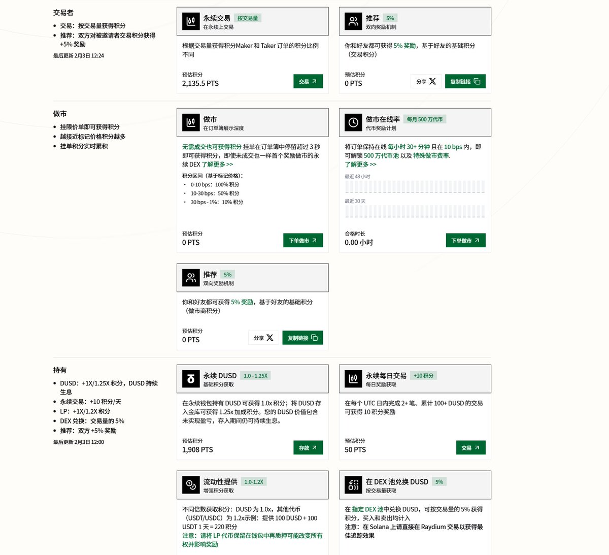 DUSD Vault 给到 1.25x,Perps Wallet 是 1x,很明显在引导大家把不用的资金放去吃收益和高倍积分,而把活跃资金留在交易账户。