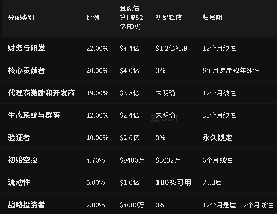 在 FDV 大约 2 亿美金的估值框架下,并不是一次性全流通,而是有比较明确的锁仓规则。