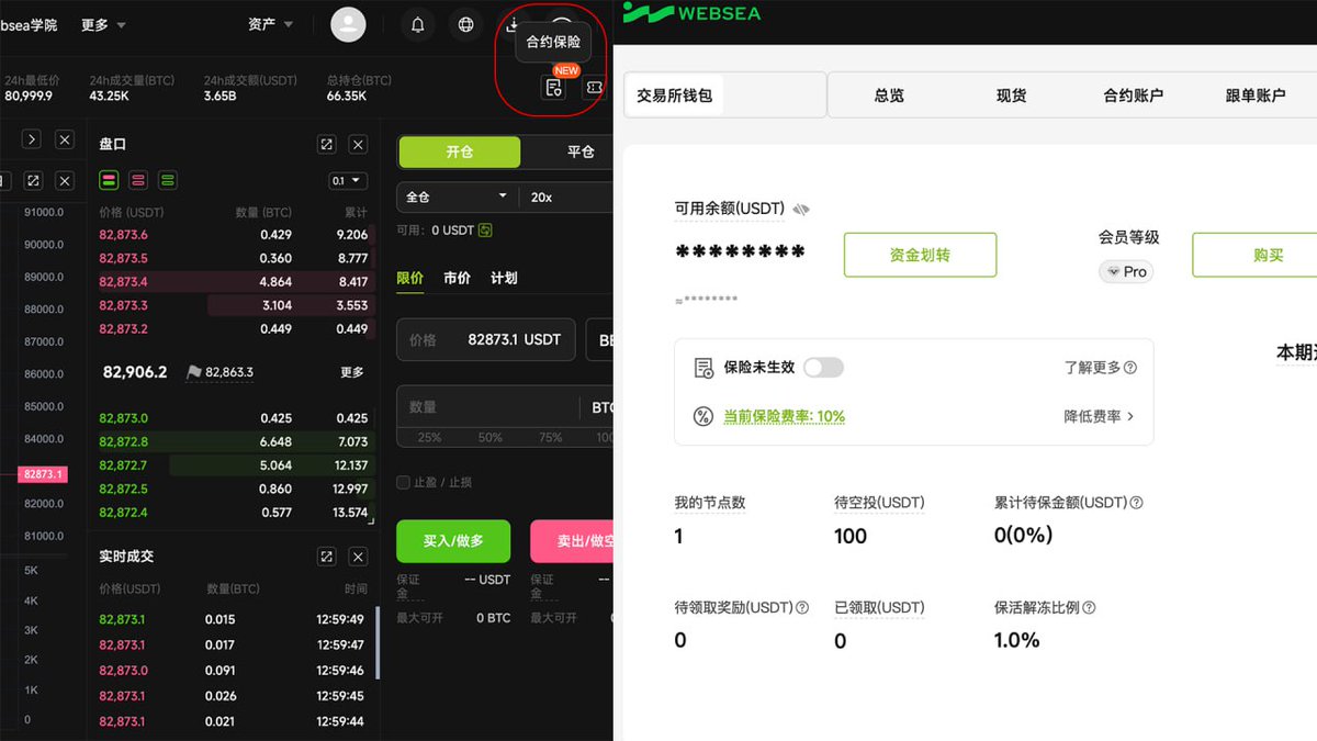 开通合约账户后Websea有个“合约保险”,我体验了下,大致的逻辑就是你在做合约交易时,不管是赚还是亏,都会产生一部分保费!
